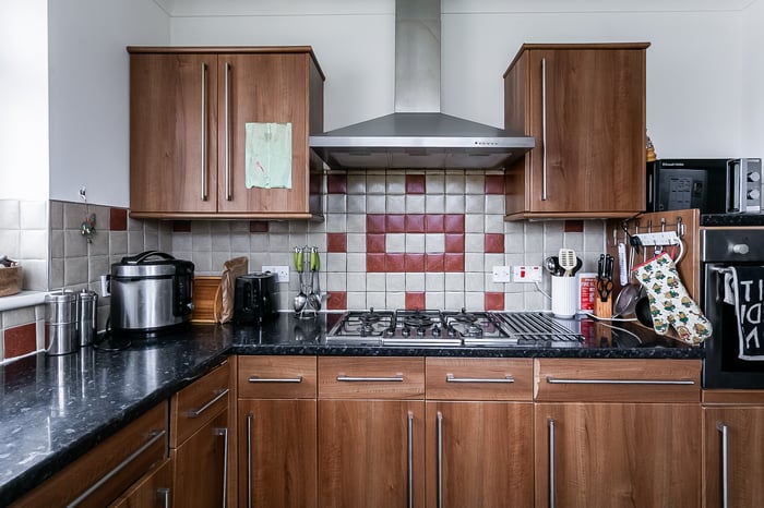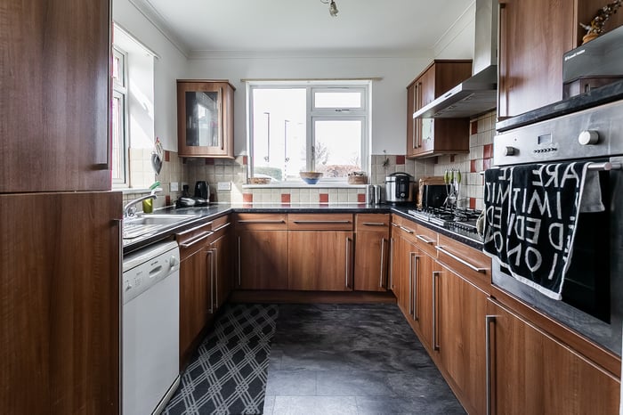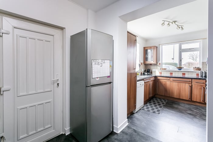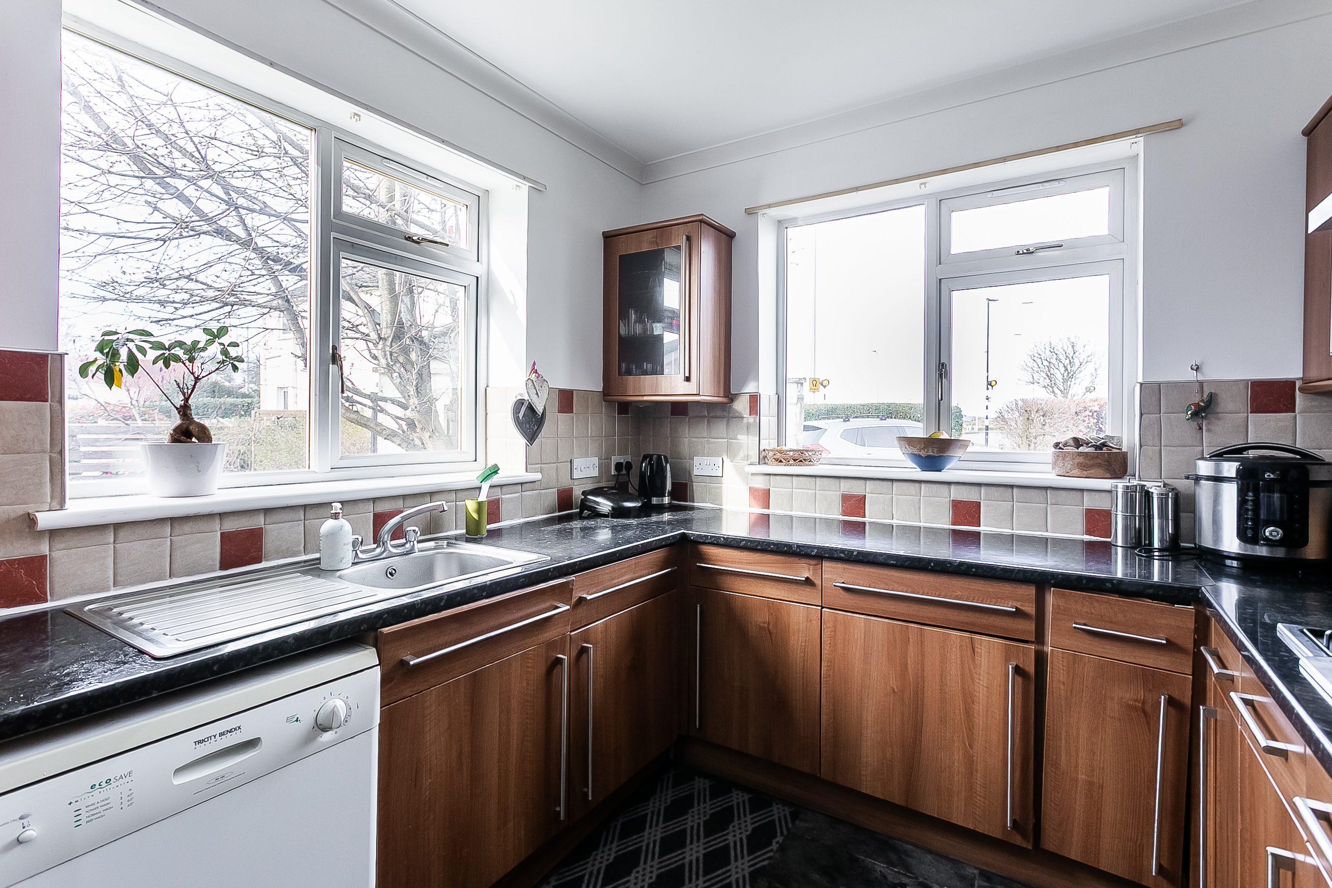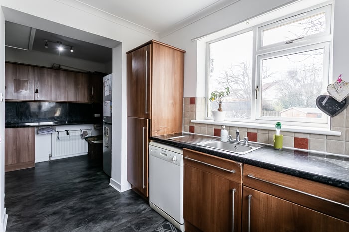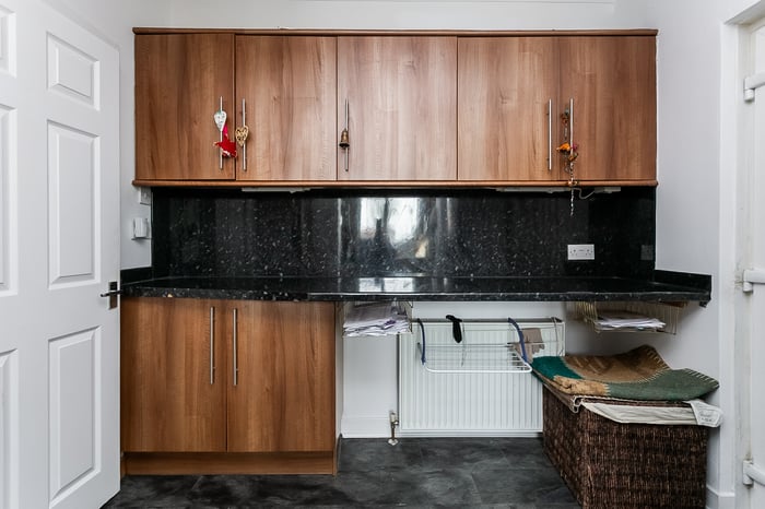 The kitchen is finished with granite-effect countertops and a tiled-effect splashback, complete with a stainless steel sink and drainer, as well as an integrated oven and five-ring gas hob with canopy above, plus additional space for appliances and a convenient utility/storage room just off the kitchen. Towards the front of the property, there is a convenient shower room with an electric shower and a ladder-style radiator.
