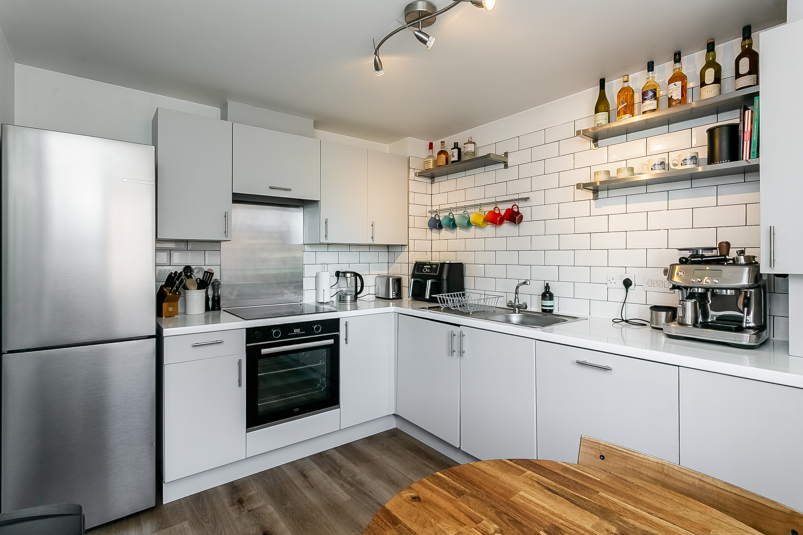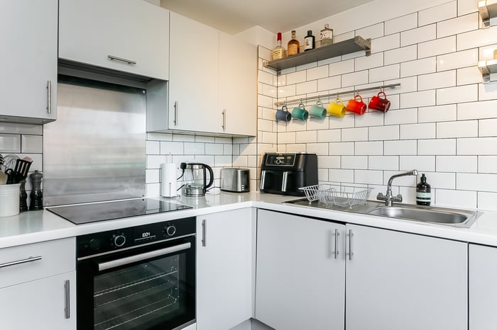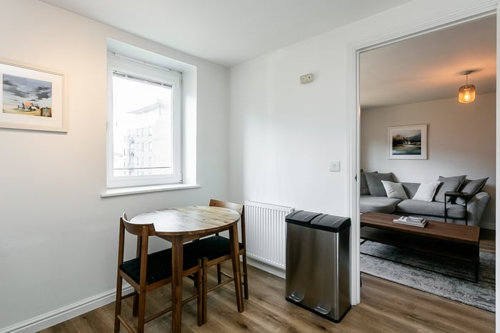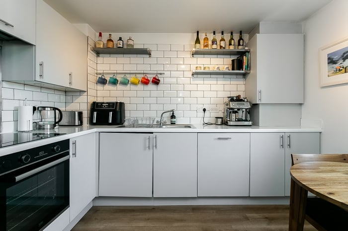 A balcony door draws in plenty of natural light and provides direct access to a balcony, seamlessly extending the living room. Accessed from the living room, the modern fitted kitchen and dining area has integrated appliances, including a washing machine, dishwasher, oven and induction hob, offering both style and functionality.
