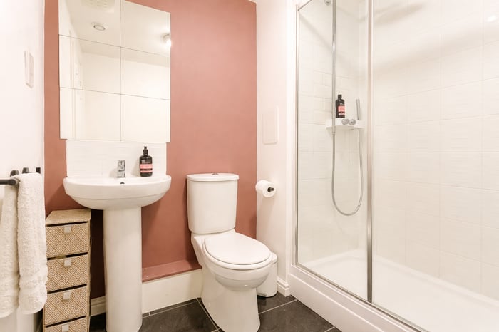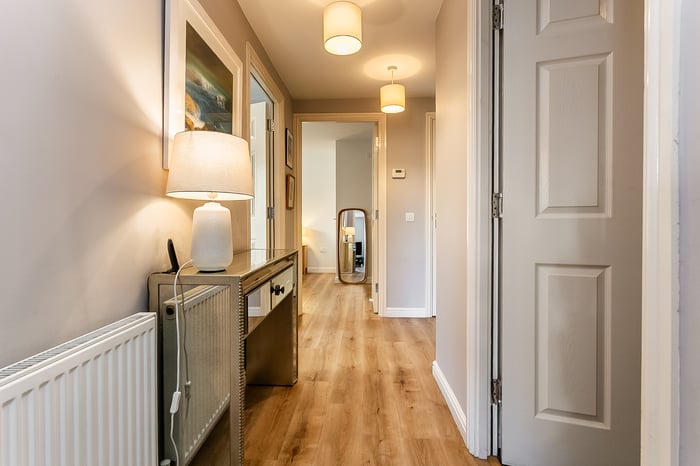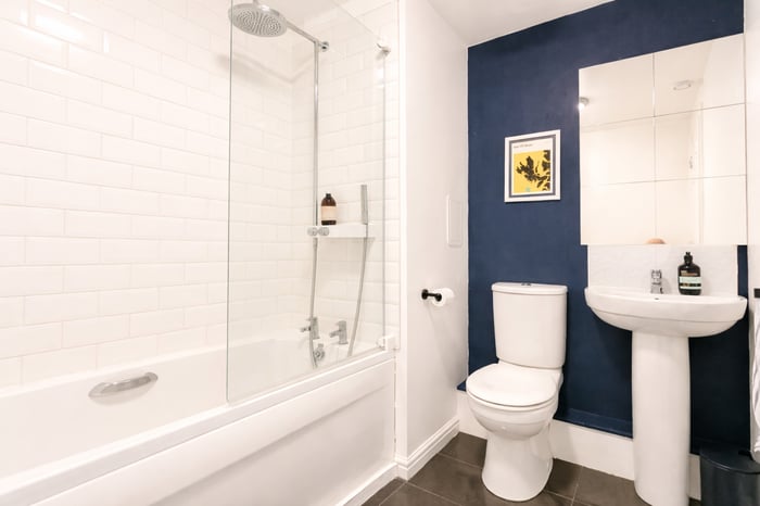 Completing the property, the three-piece fitted bathroom comprises tiled flooring, a central light fitting and a tiled splashback surround, with a rainfall showerhead over the bath creating a stylish and contemporary finish.