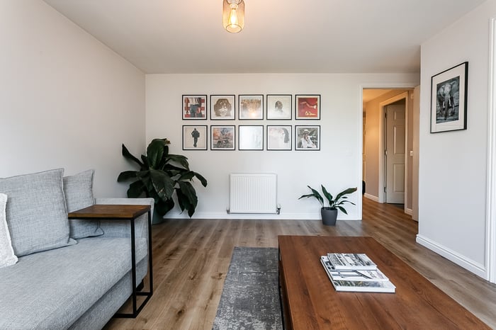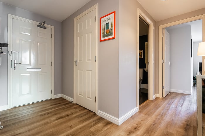The welcoming entrance hall offers access to all rooms within the property and benefits from two built-in storage cupboards conveniently positioned near the front door, providing excellent everyday practicality. The living room is a bright and inviting space, and the generous proportions allow for a variety of furniture layouts, creating a comfortable setting for both relaxing and entertaining.