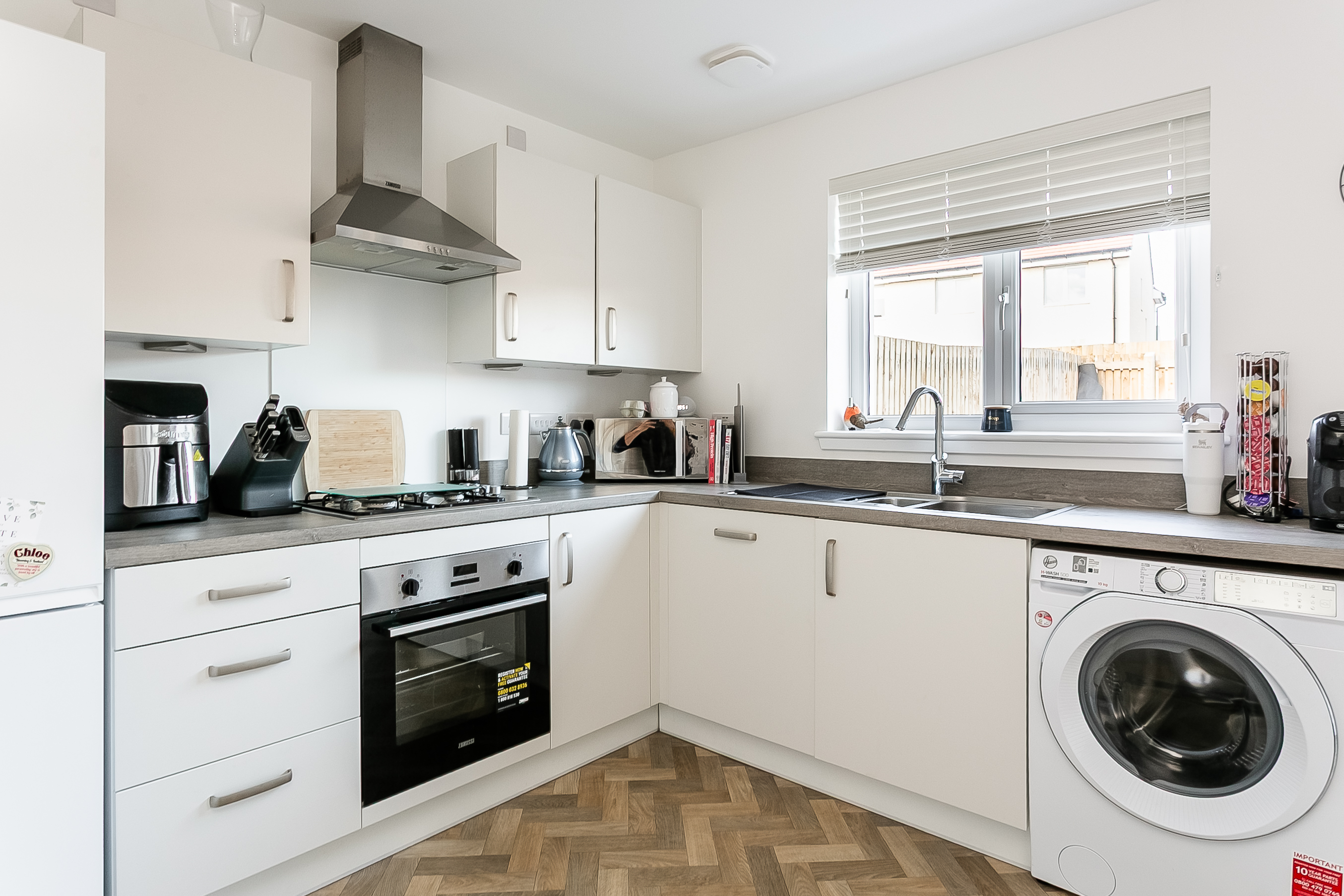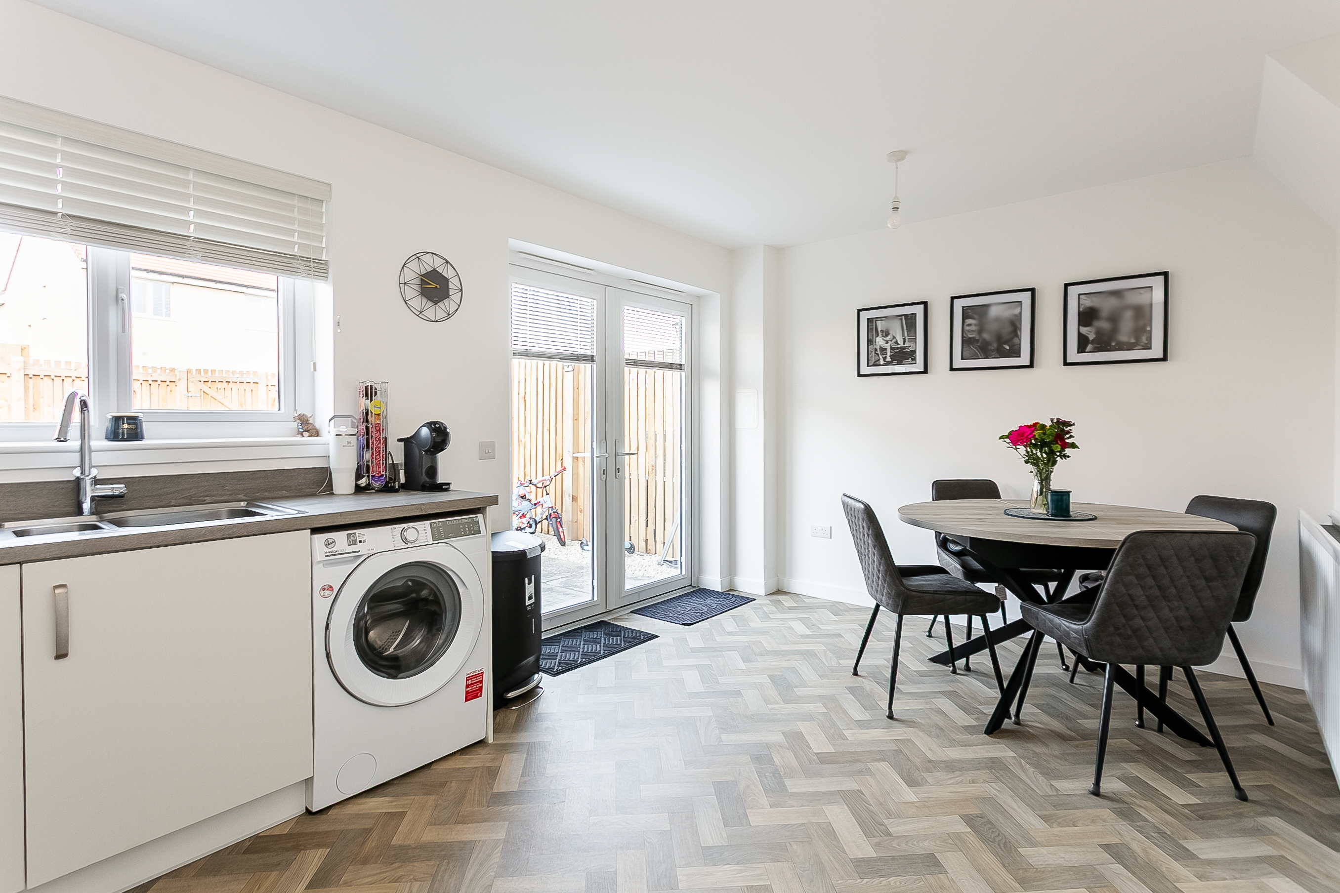 The hallway leading to the kitchen features a conveniently located WC along with a useful storage cupboard. The kitchen/dining room is fitted with wood-effect flooring, modern countertops with matching upstands, a stainless steel sink with drainer, an integrated oven and gas hob with canopy above, as well as a dishwasher, fridge/freezer, and additional space for appliances.