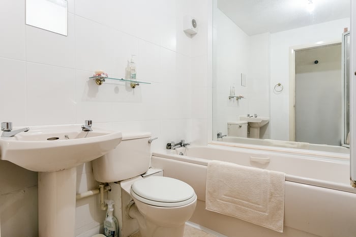 The accommodation is completed by a three-piece bathroom with stone-effect flooring, a tiled splashback surround, a central light fitting, and a shower over the bath, combining functionality with a clean, modern look.