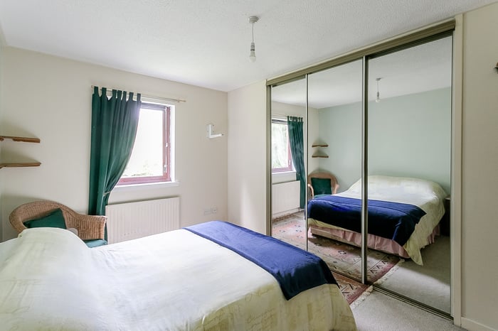 The generous primary bedroom benefits from a built-in wardrobe with mirrored sliding doors, offering ample storage without compromising on space. The second bedroom, equally inviting, includes a built-in storage cupboard and is well-proportioned, making it ideal as a guest room, home office, or nursery.