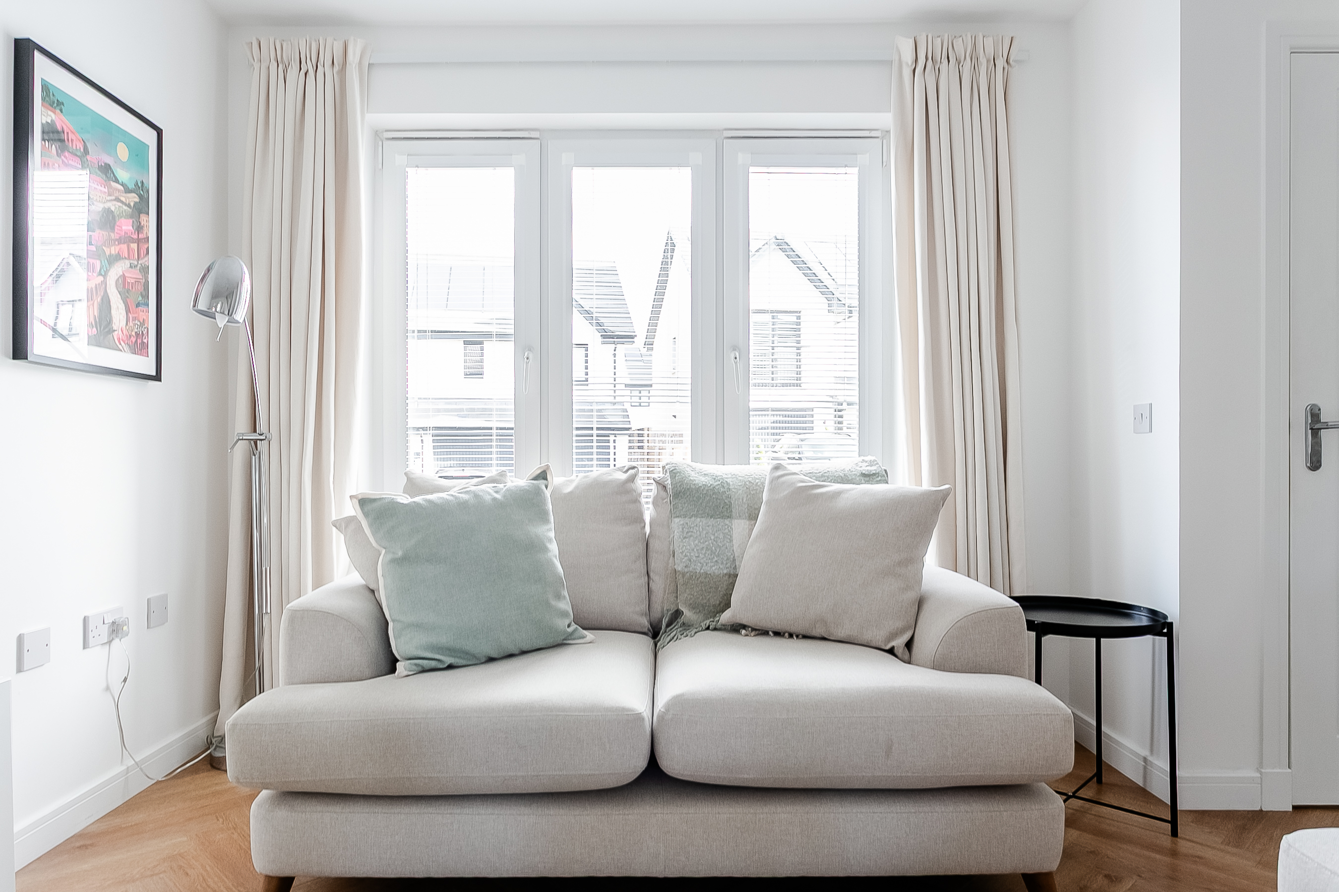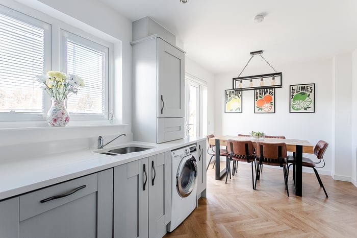A central light fitting enhances the contemporary feel, while two built-in storage cupboards provide excellent and discreet storage solutions, helping to keep the space clutter-free. The stylish flooring flows effortlessly through to the modern kitchen and dining room, creating a cohesive and contemporary living space.