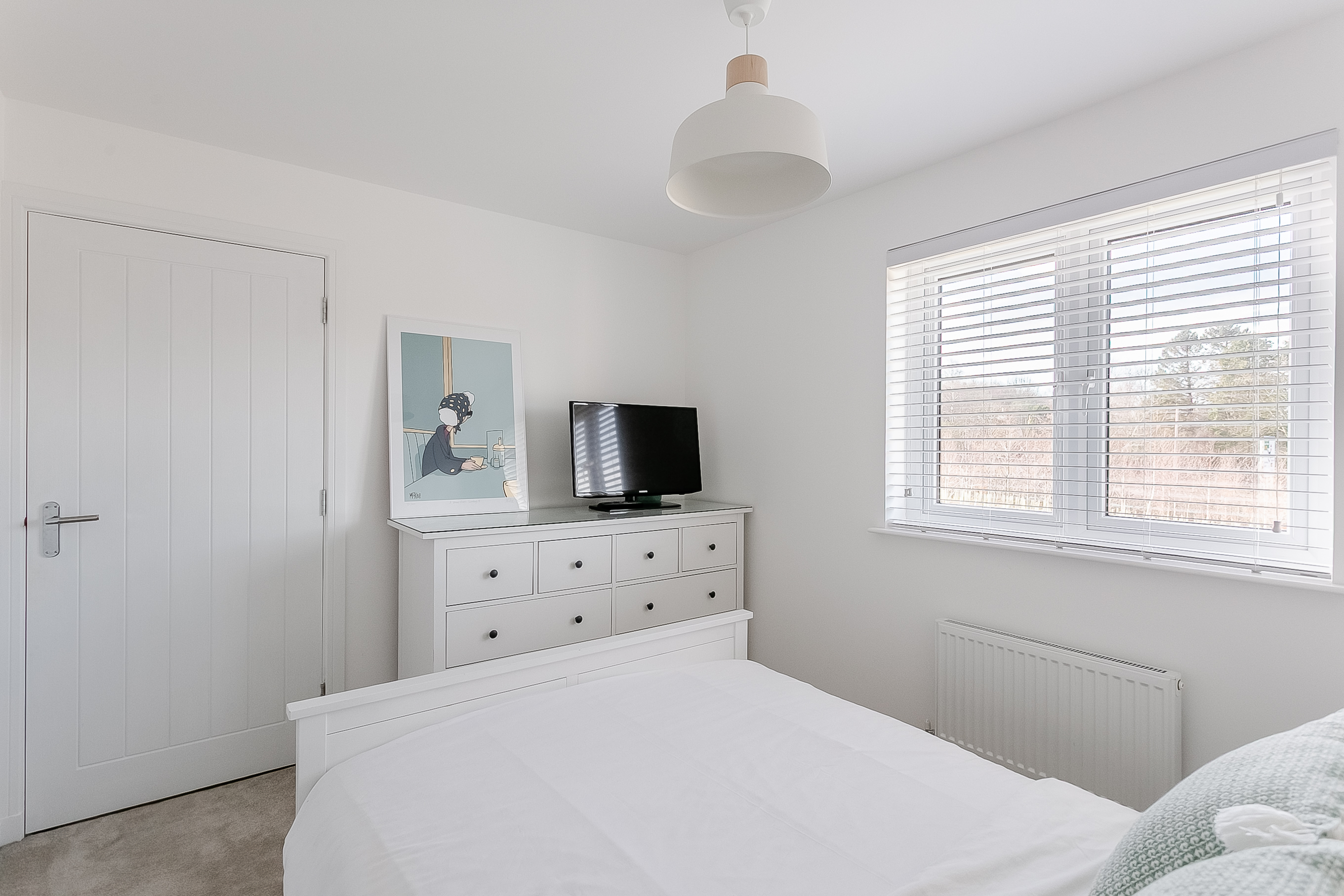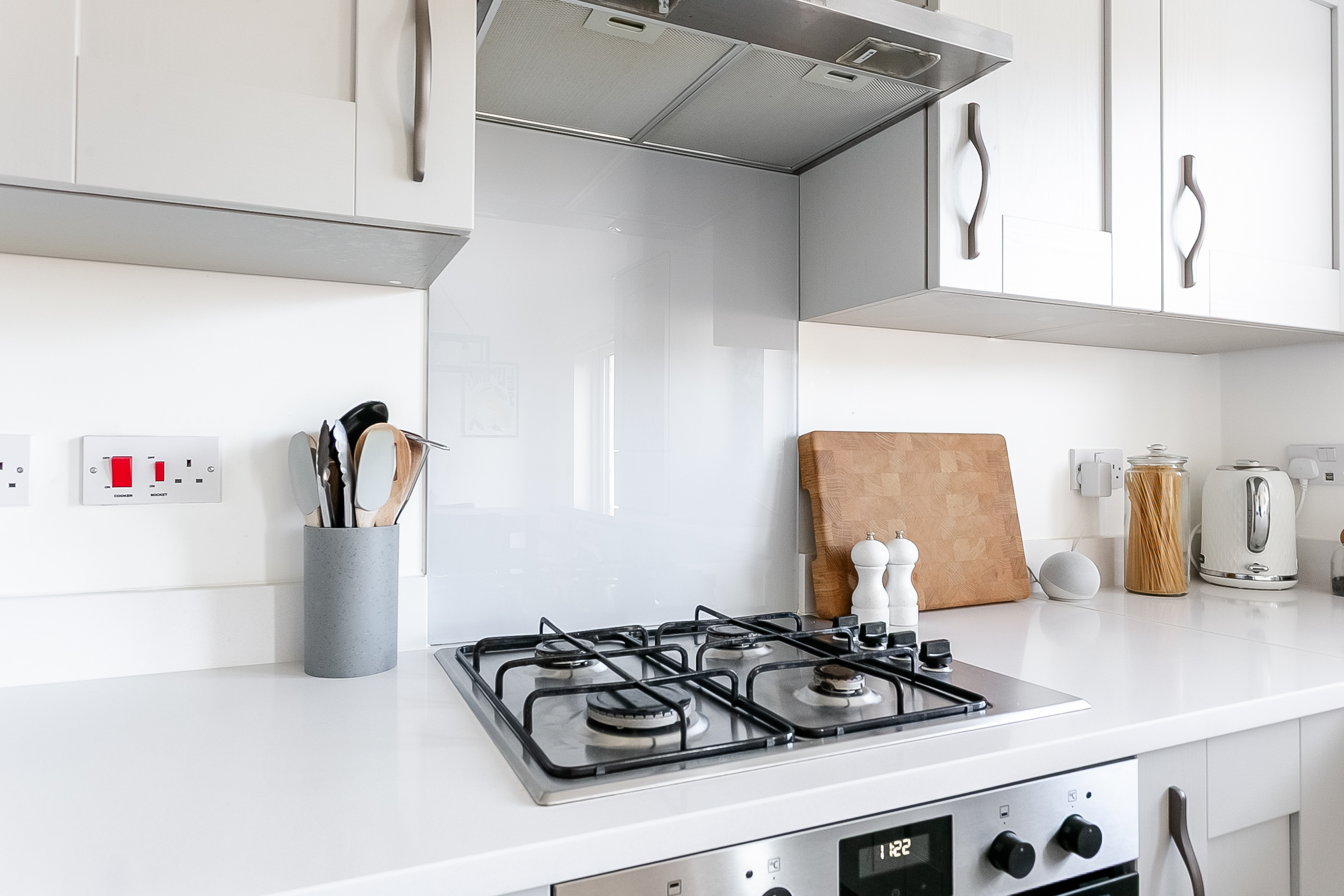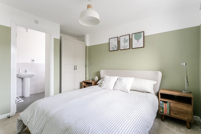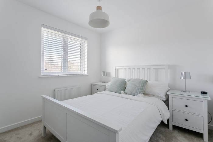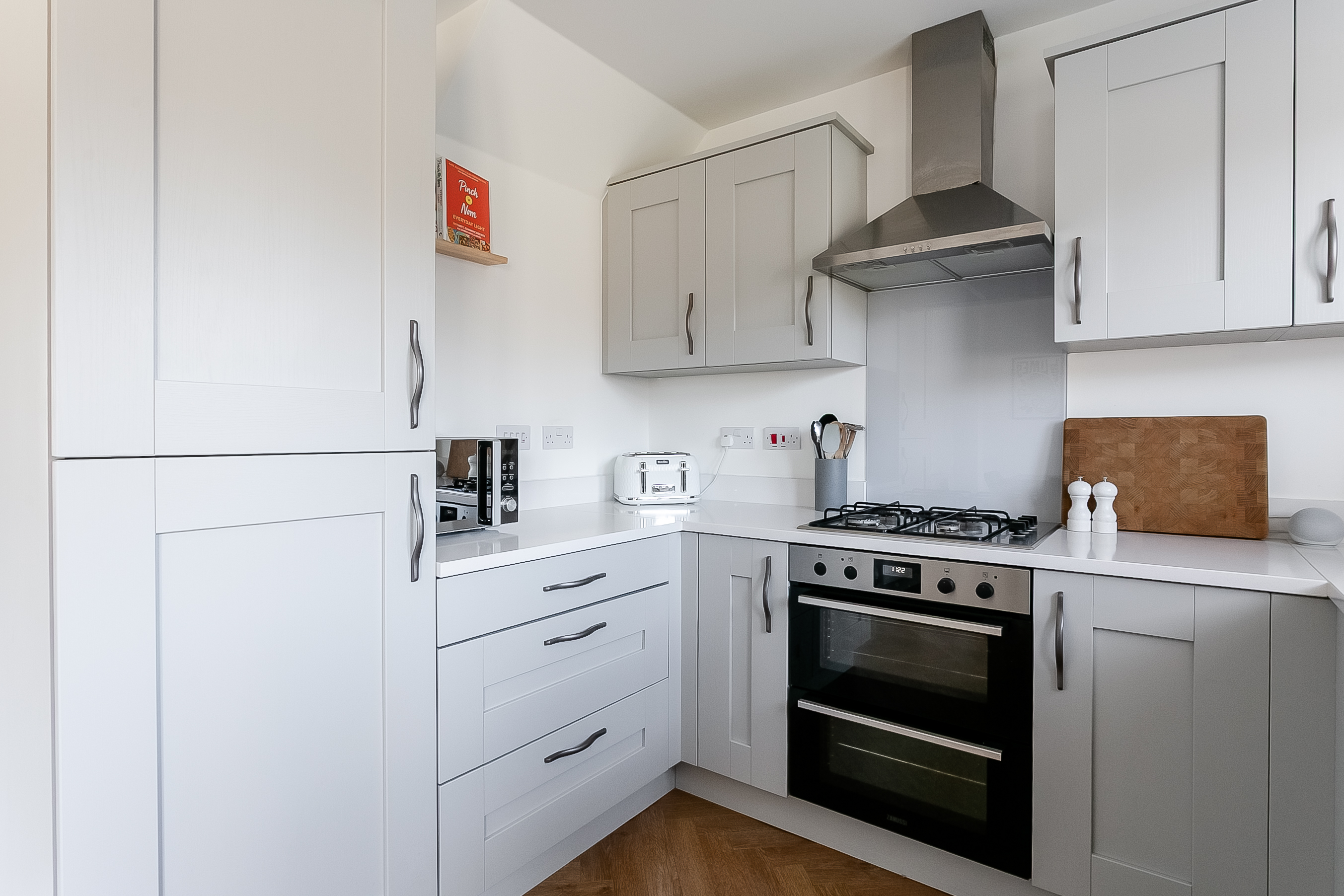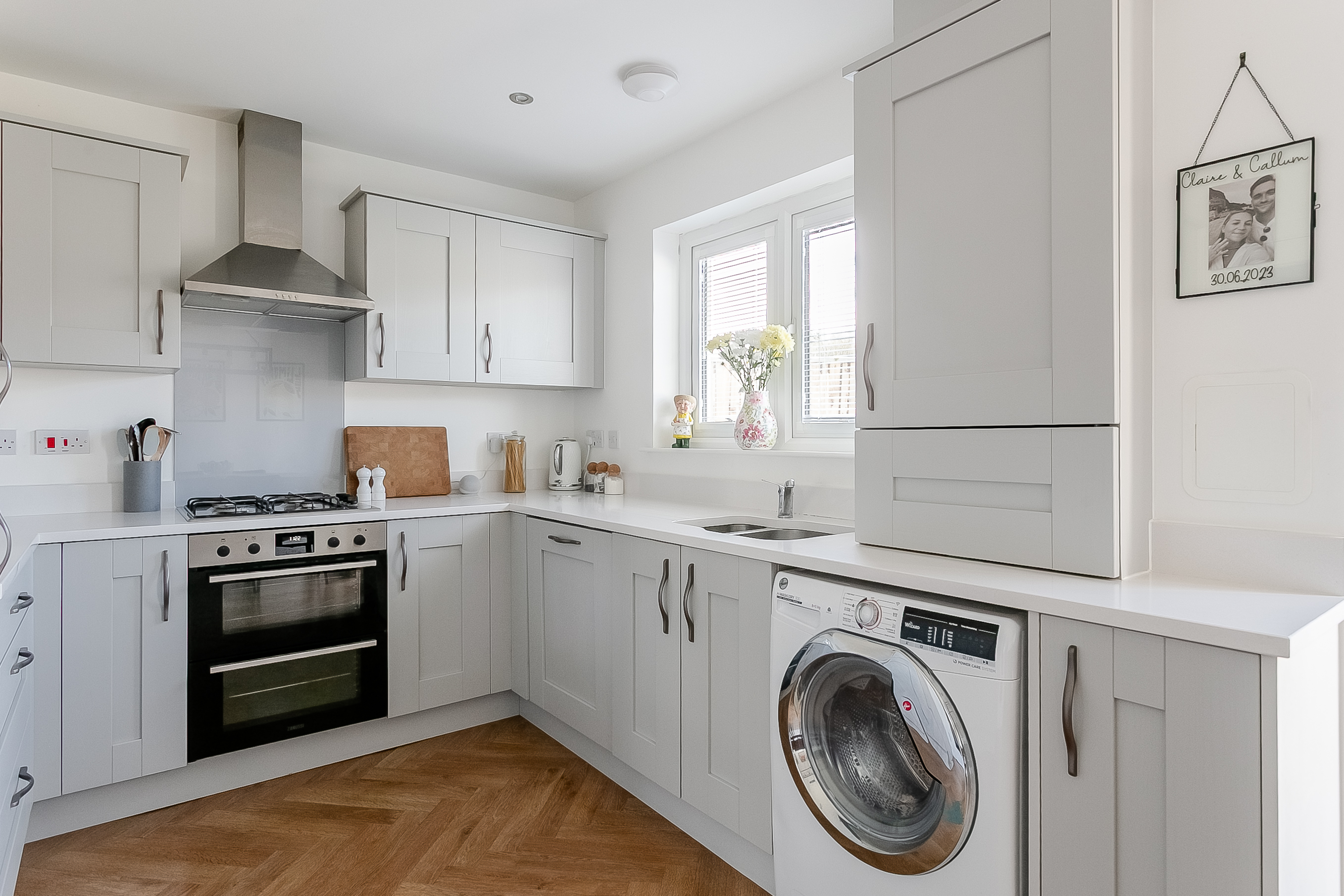 Integrated appliances include a fridge freezer, dishwasher, double oven and gas hob with canopy above, offering both practicality and style. Upstairs, the master bedroom provides a peaceful retreat, complete with soft carpeted flooring and a central light fitting.