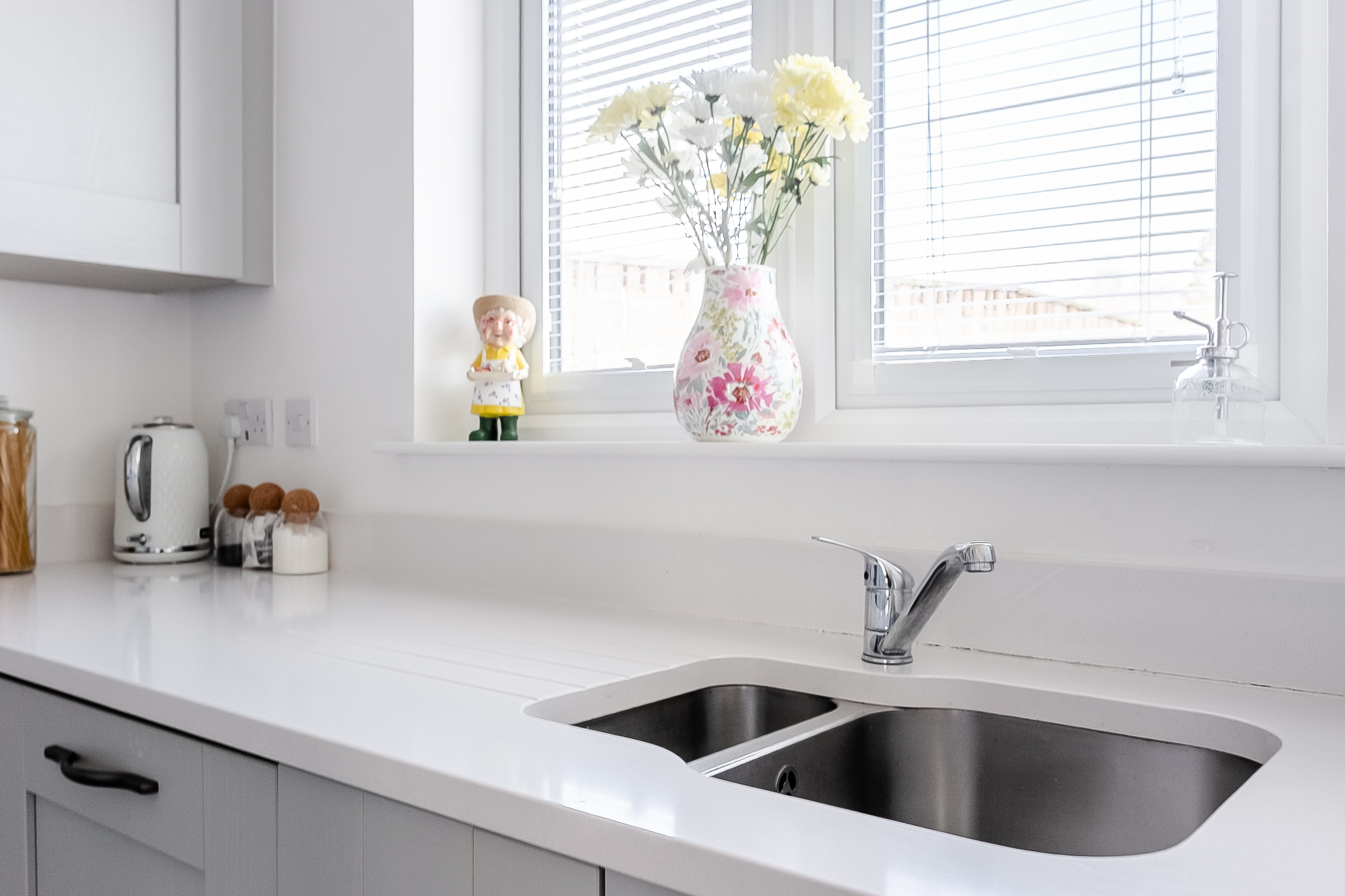 This impressive area is perfectly suited to modern lifestyles, with ample room for a family dining table and direct access to the rear garden through elegant French doors, allowing natural light to pour in. The kitchen is fitted with sleek units and Silestone worktops, complemented by spotlighting and a sink with a drainer.