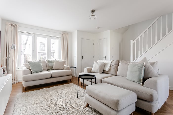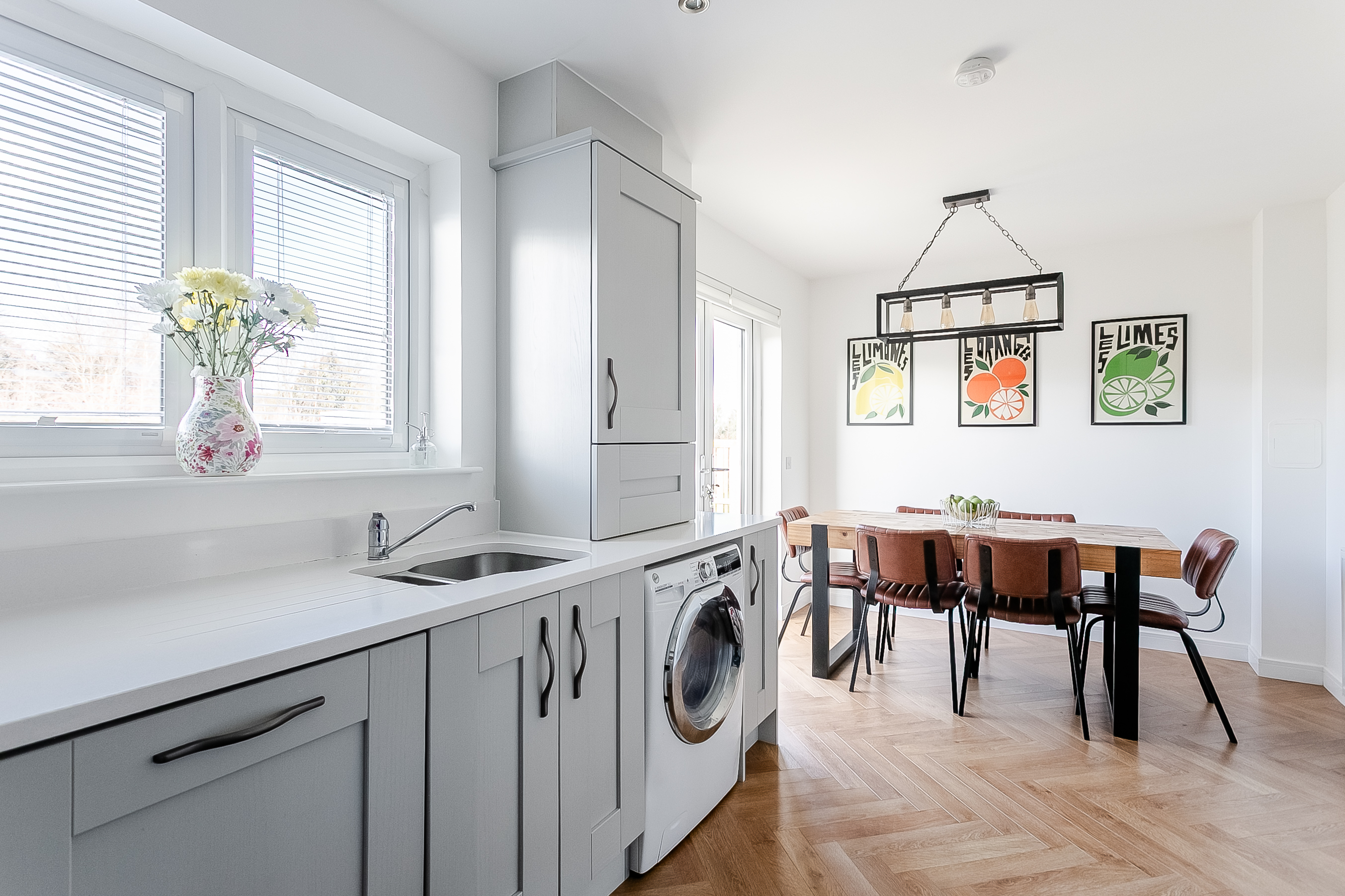 The generous living room is a standout feature, beautifully presented with wood-effect herringbone-style flooring that adds warmth and character. Flooded with natural light, this spacious reception area offers ample room for both comfortable seating and additional furnishings, making it ideal for relaxing evenings or entertaining family and friends.