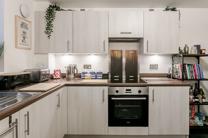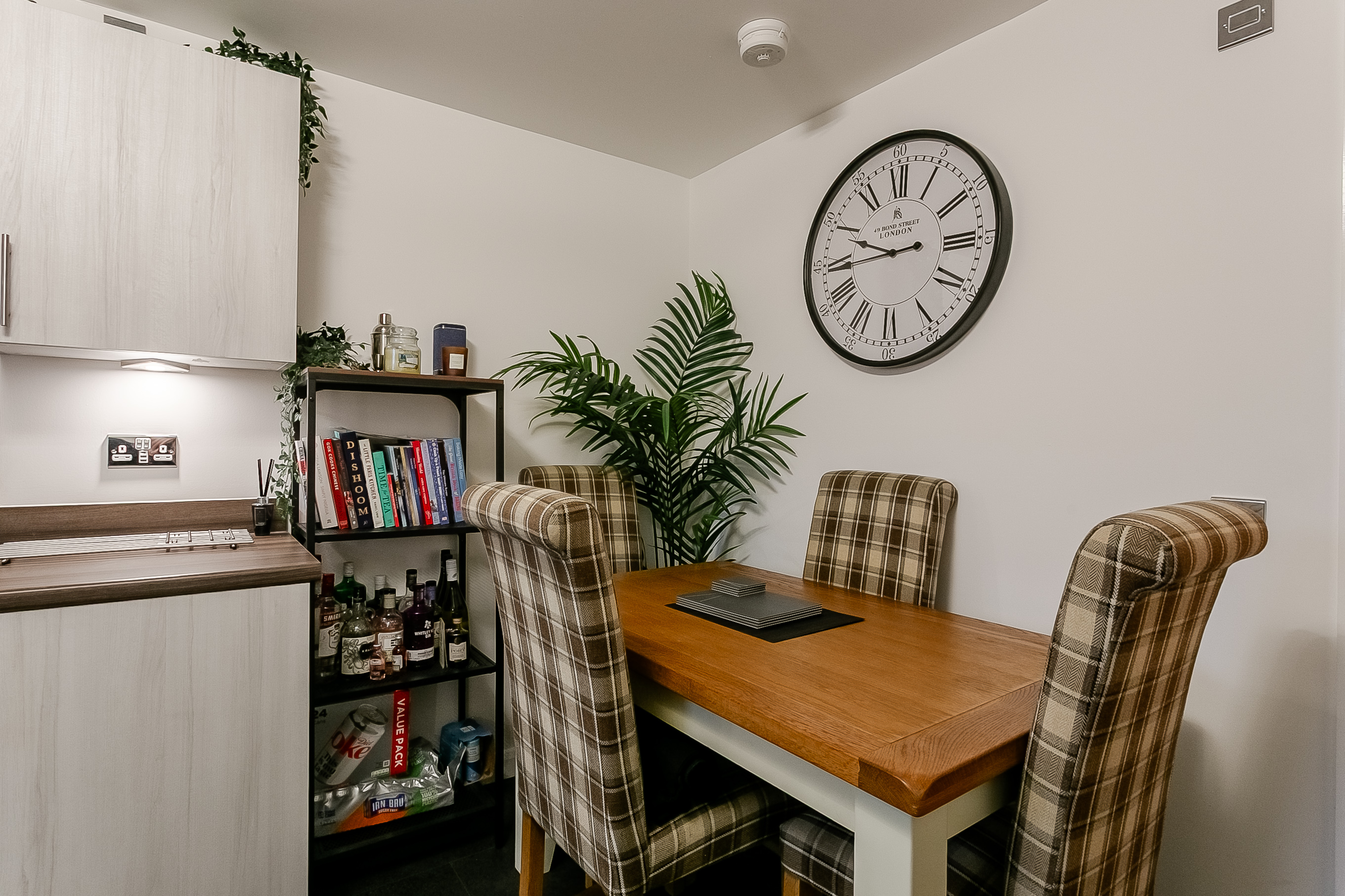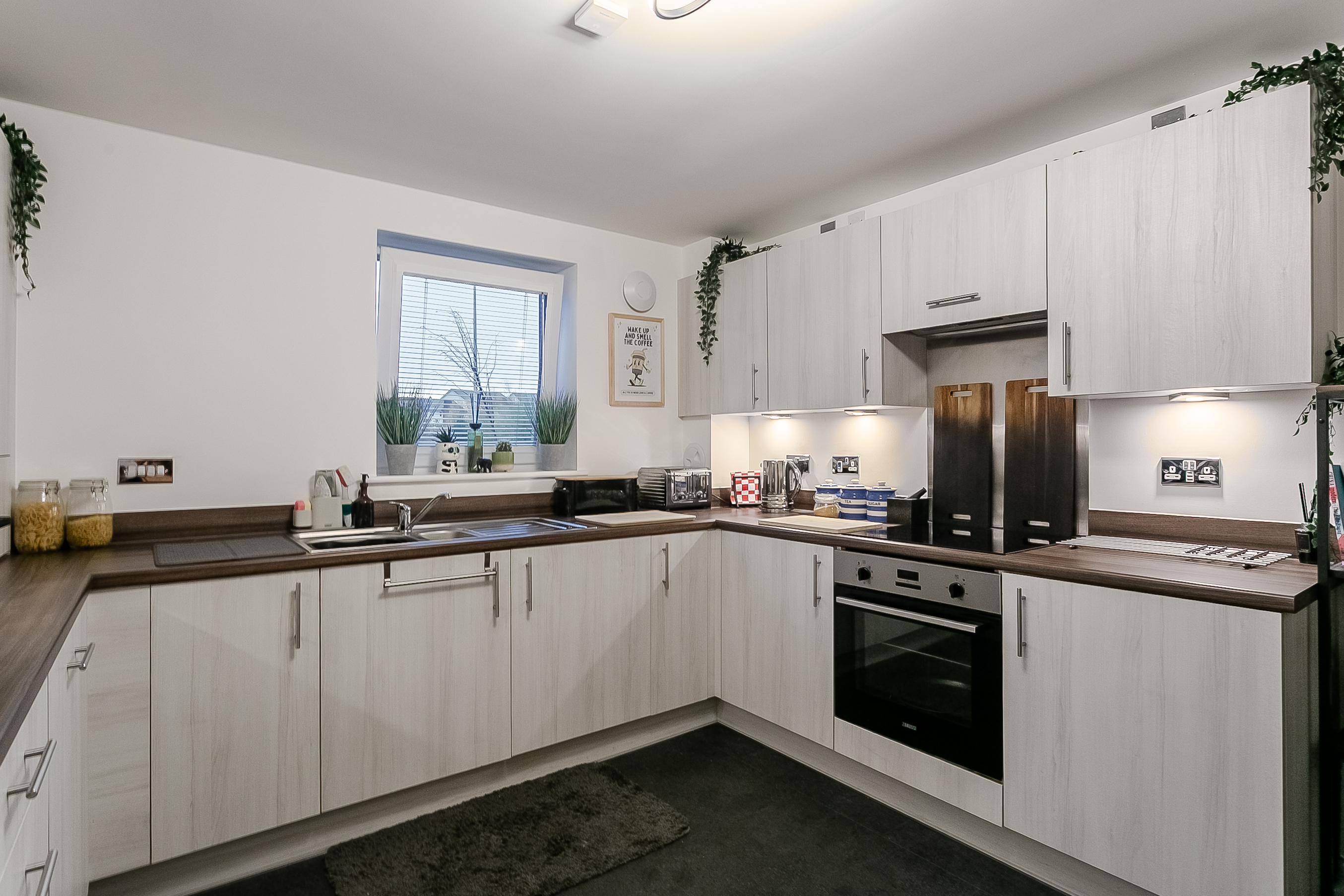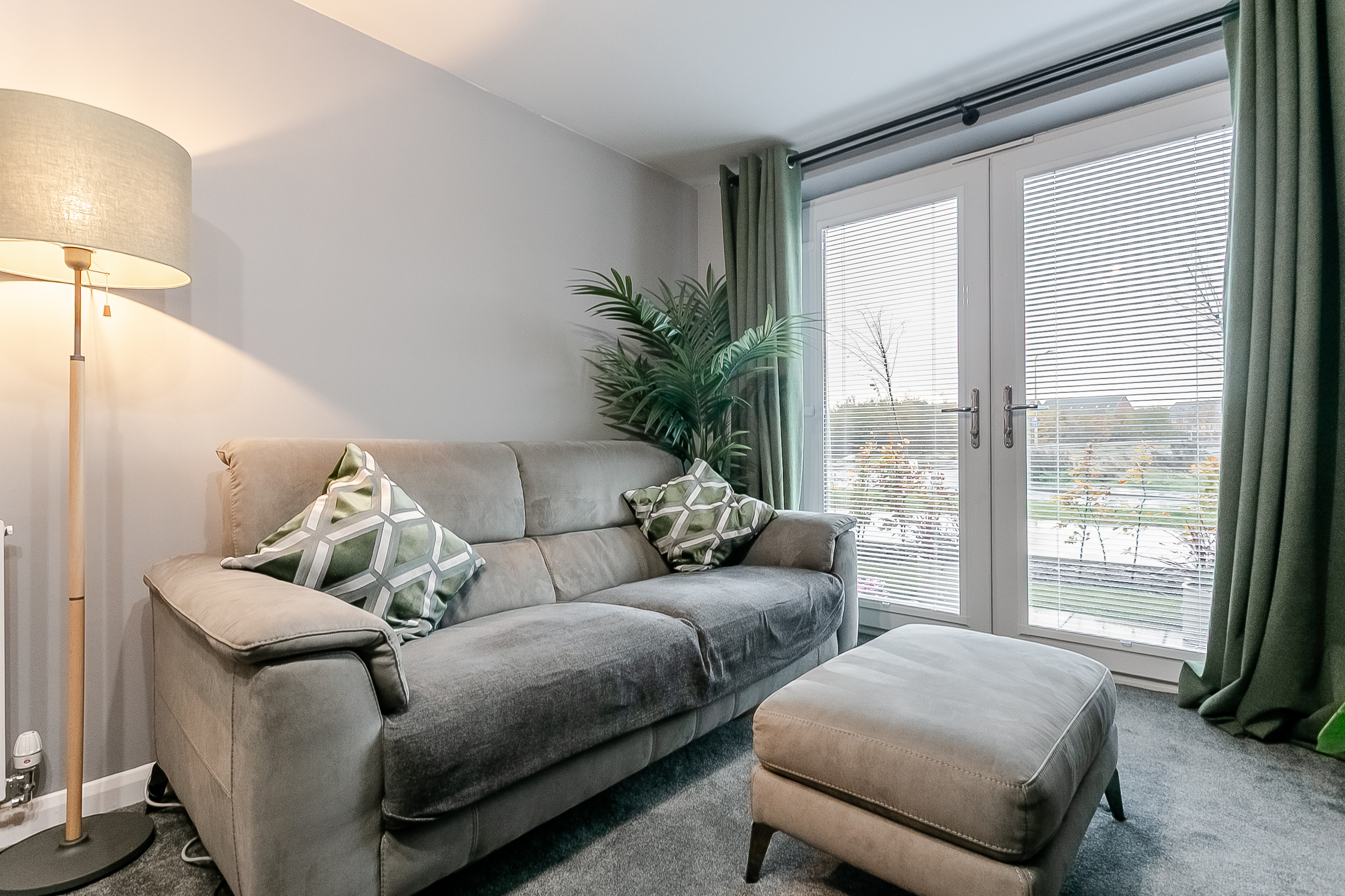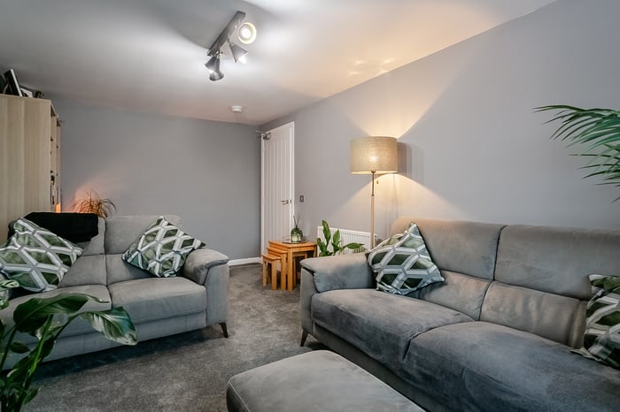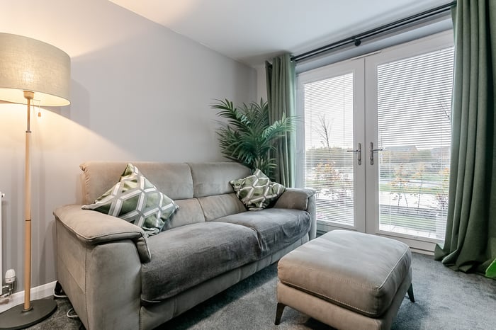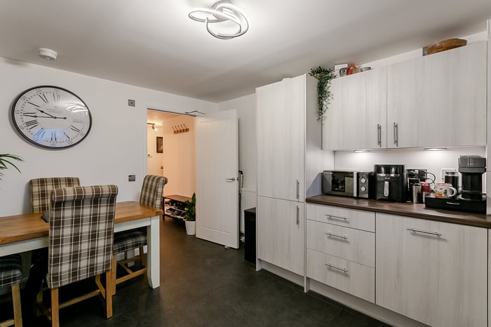 The living room features carpeted flooring underfoot, light modern décor, and direct access to the patio, creating a bright and inviting space. To the front, the kitchen and dining area offer a sleek modern finish with matching countertops and upstands, a stainless-steel sink with drainer, an integrated oven and electric hob with canopy, as well as a washing machine, dishwasher, and fridge-freezer.