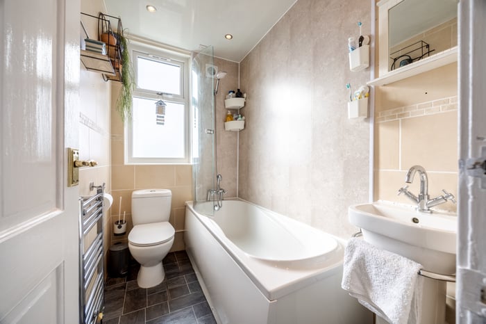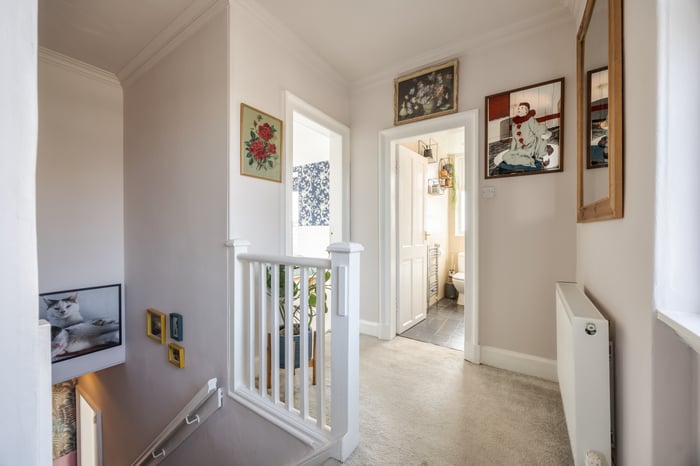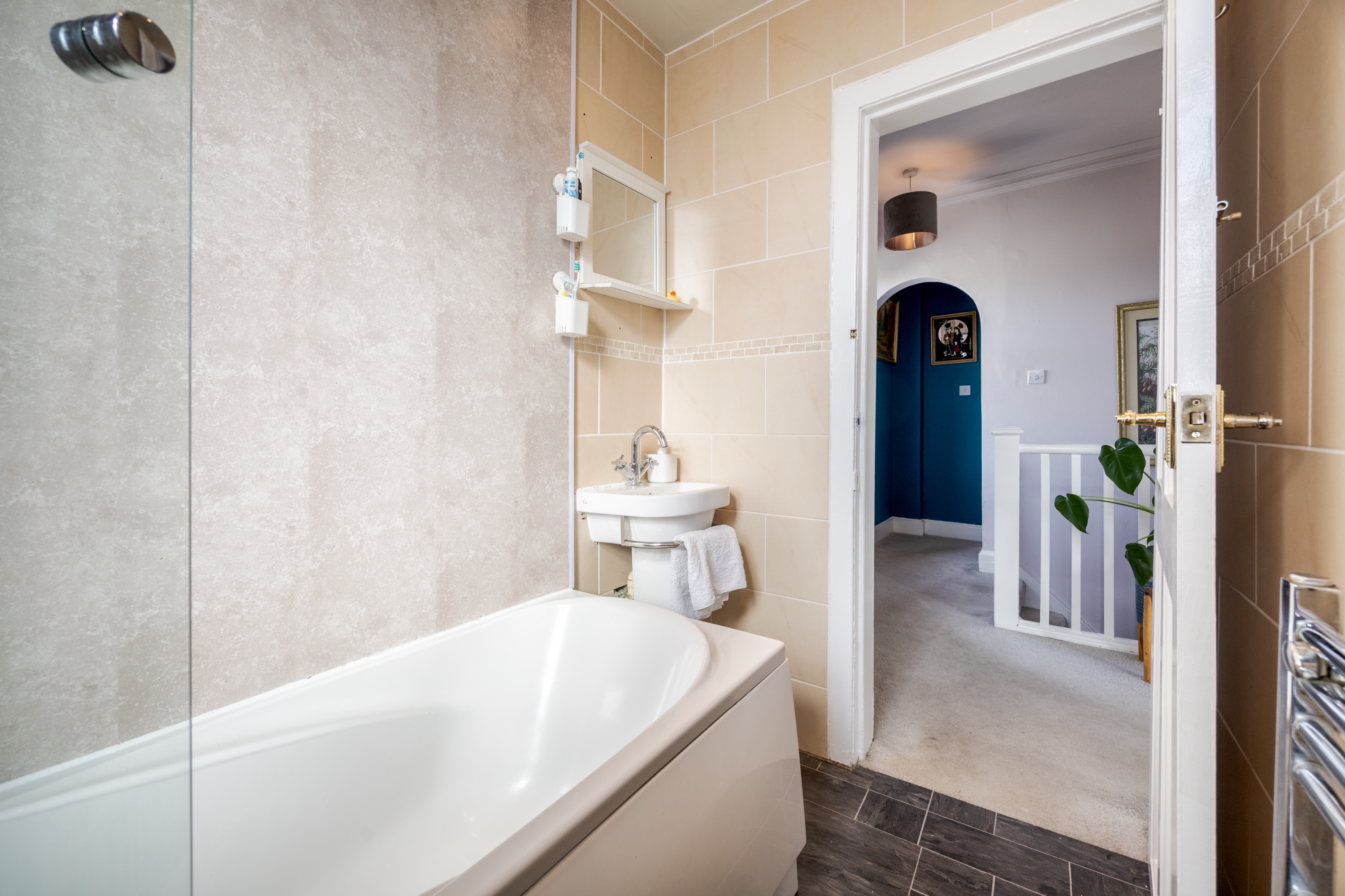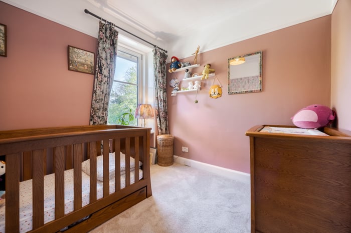 Two further bedrooms on this level are also carpeted and offer flexible use, ideal as additional sleeping accommodation, a home office, or nursery. The contemporary three-piece family bathroom is fitted with tiled flooring, spotlighting, a tiled surround, a shower over the bath, and a ladder-style radiator.