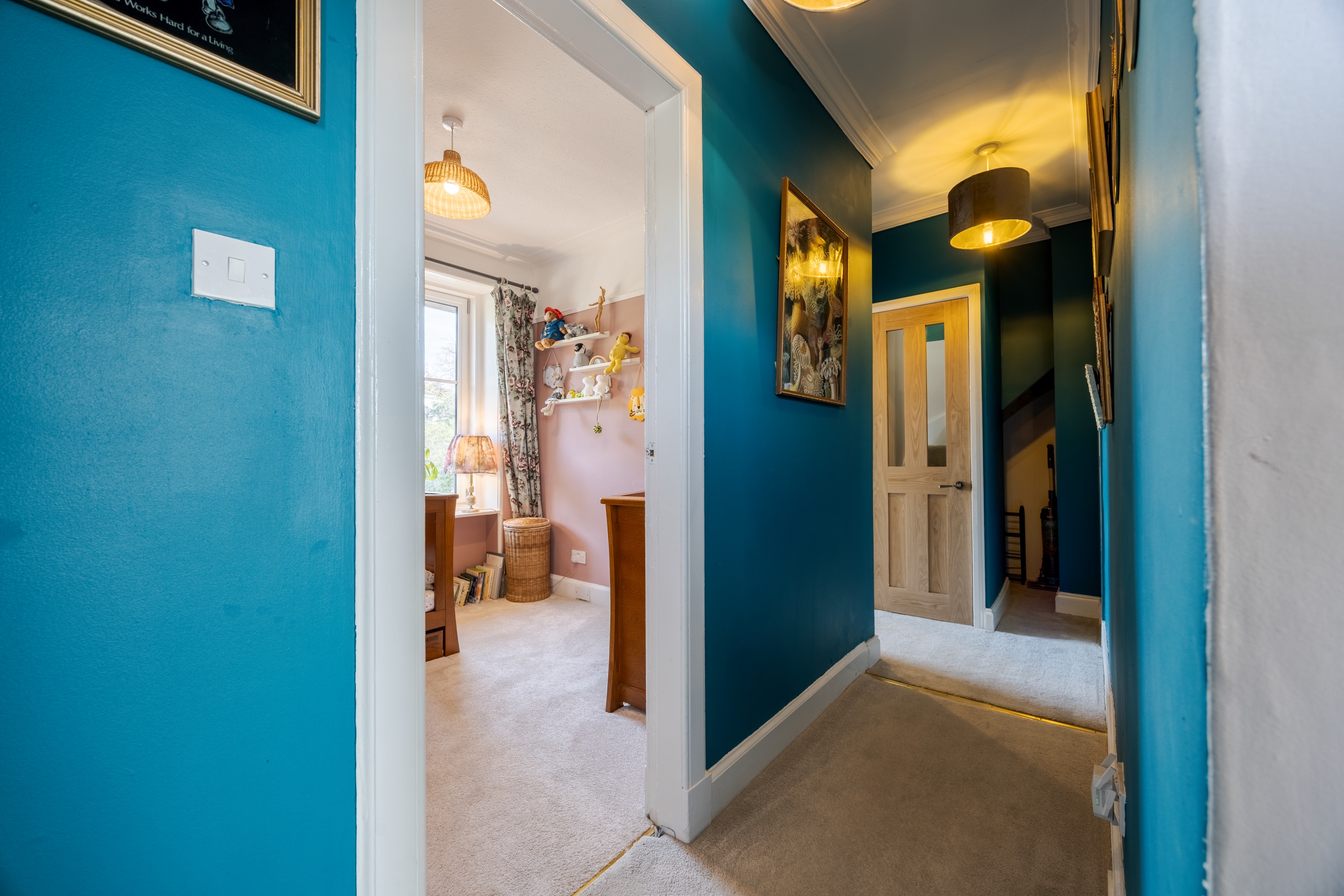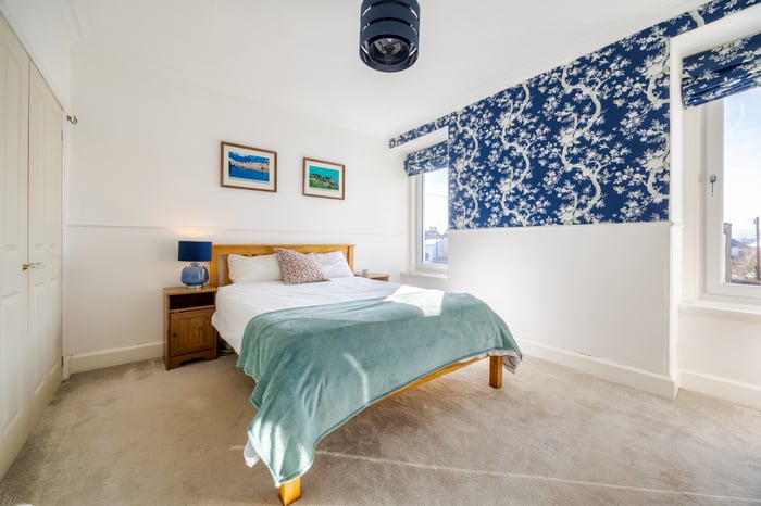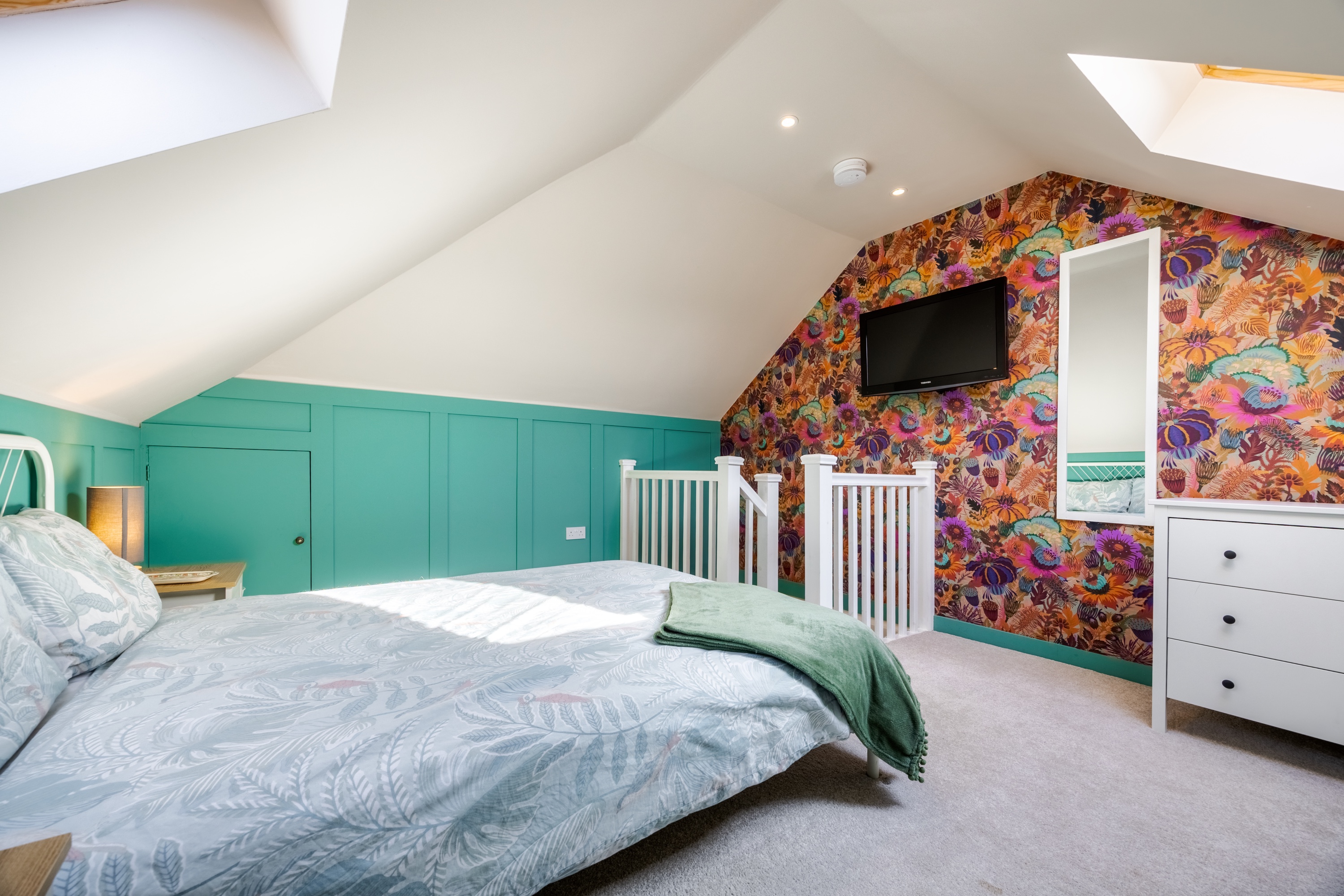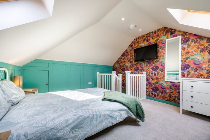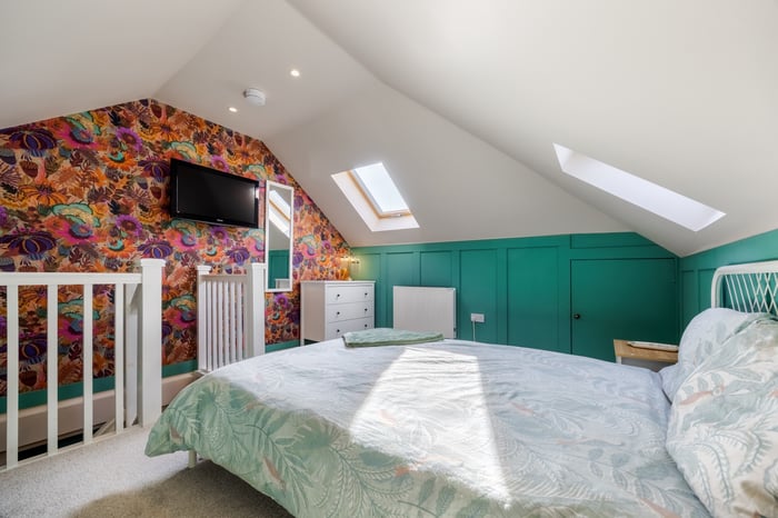 The second floor completes the accommodation with a bright fourth bedroom, featuring carpeted flooring, spotlighting, a wall-mounted TV point, and Velux windows, creating a comfortable and private space, ideal as a guest room or additional principal bedroom.