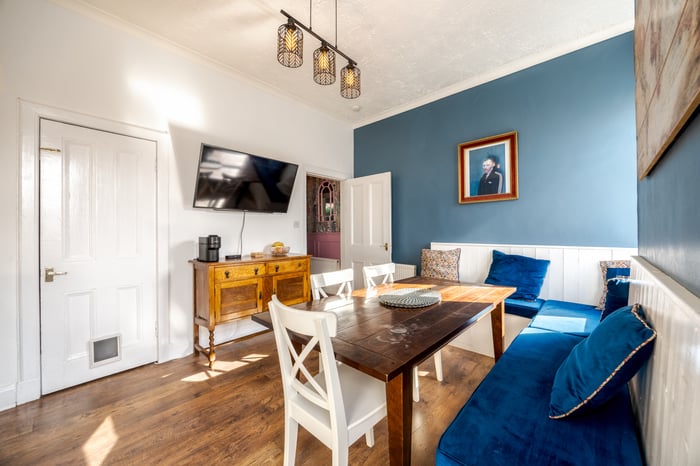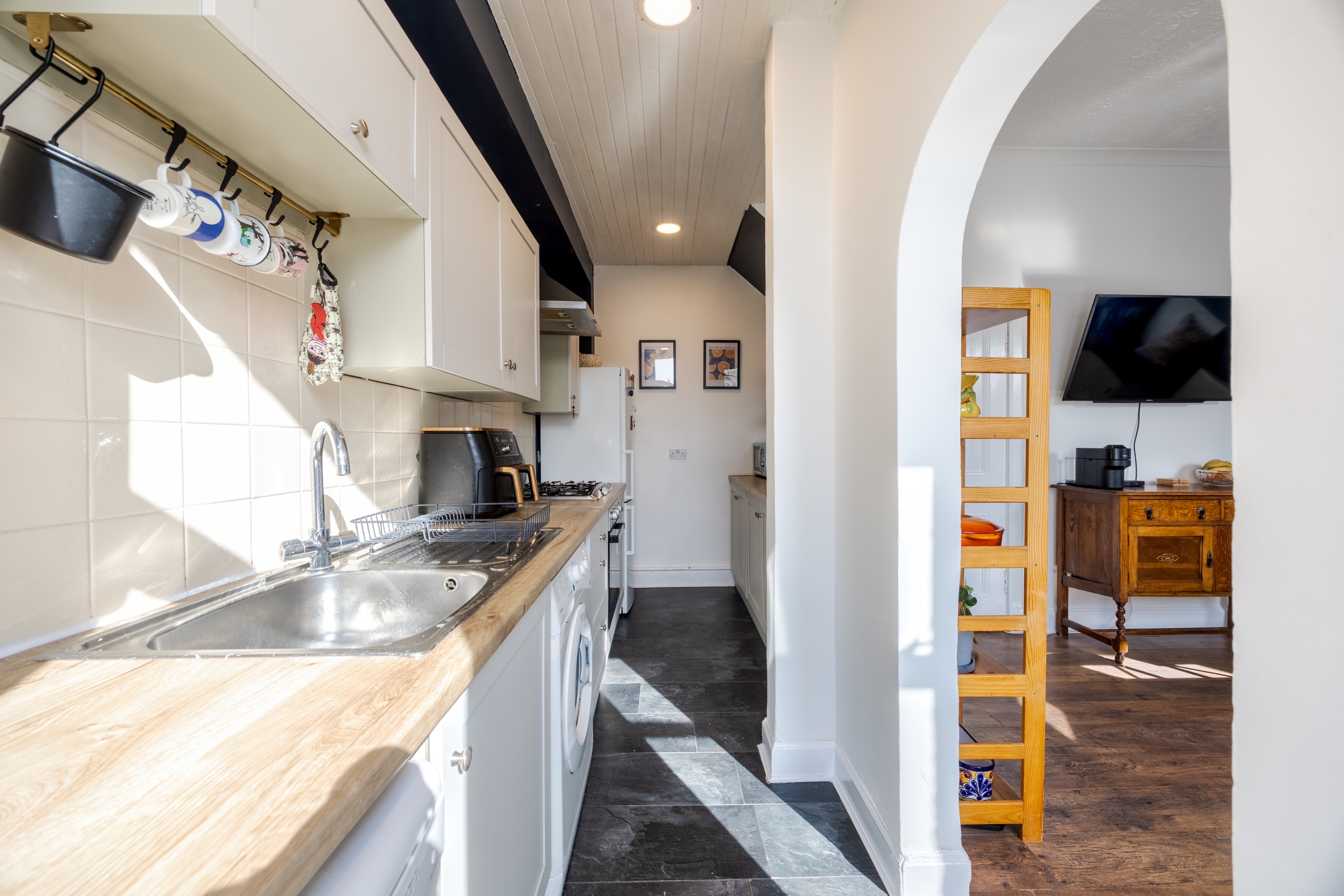 The dining room offers wood-effect flooring, a central light fitting, a built-in storage cupboard, a wall-mounted TV point, and large windows allowing for an abundance of natural light. Open to the dining area, the modern fitted kitchen is well-appointed with tiled-effect flooring, laminate worktops, a tiled splashback, spotlighting, a sink with drainer, and direct access to the rear garden.