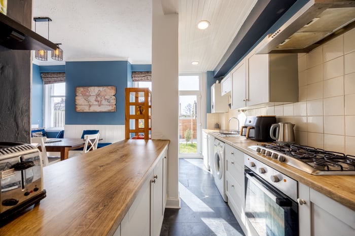 Integrated appliances include an oven and a gas hob with a canopy extractor. On the first floor, the principal bedroom is well-proportioned and benefits from carpeted flooring, a central light fitting, and a built-in wardrobe.