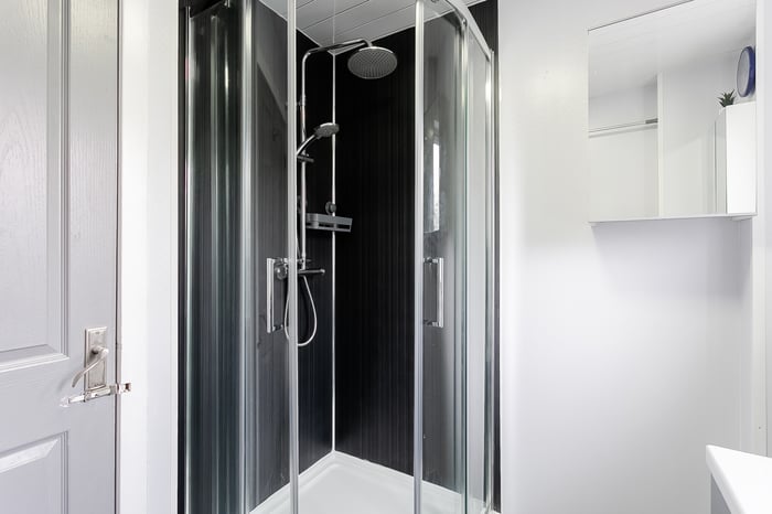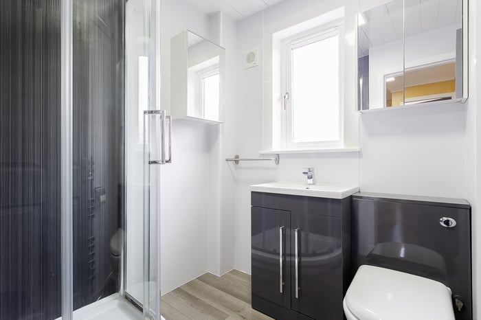 Bedroom three benefits from a built-in wardrobe, offering convenient storage without compromising on space. Completing the accommodation, the modern shower room is finished to a high standard, featuring a sleek walk-in shower enclosure with a glass screen, contemporary wall tiling, a ladder-style heated towel radiator, and a matching suite, all set against a stylish wood-effect floor.
