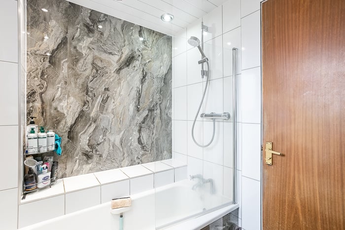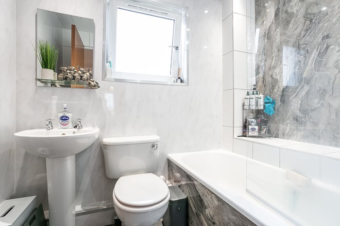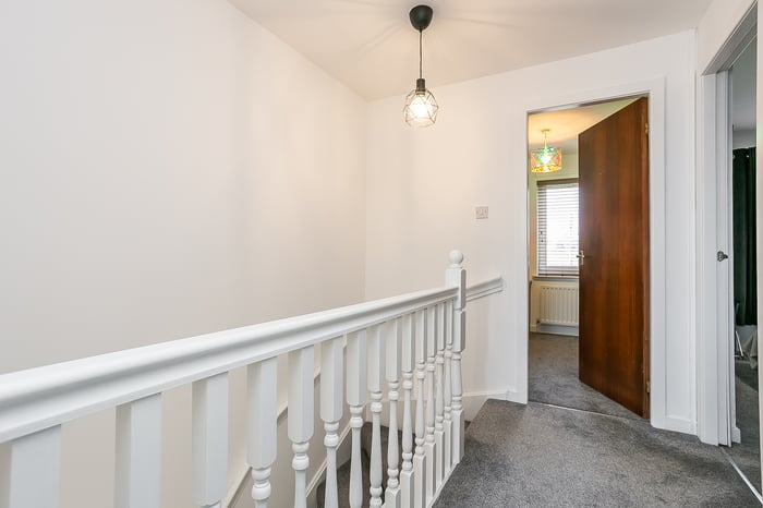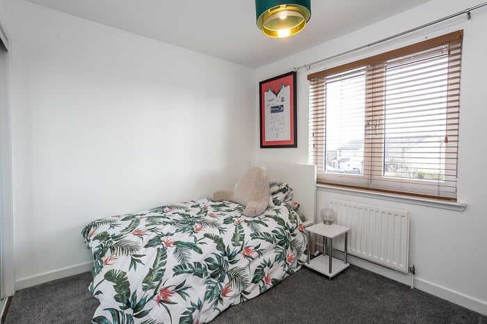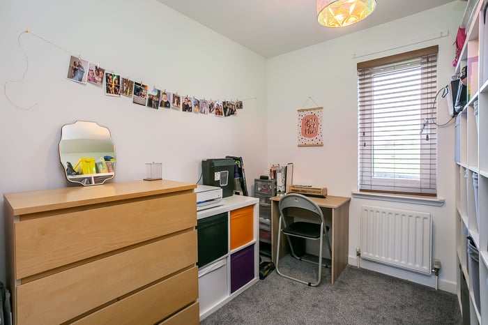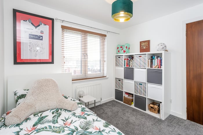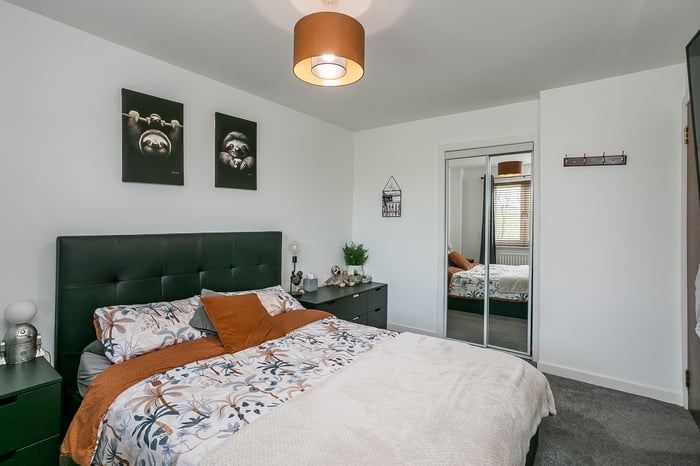 Two further carpeted bedrooms are set to opposite aspects, with bedroom two including a built-in wardrobe with mirrored doors. Completing the accommodation, a family-size bathroom is fitted with a modern three-piece suite including a shower over the bath, splash walls, and a ladder-style radiator.