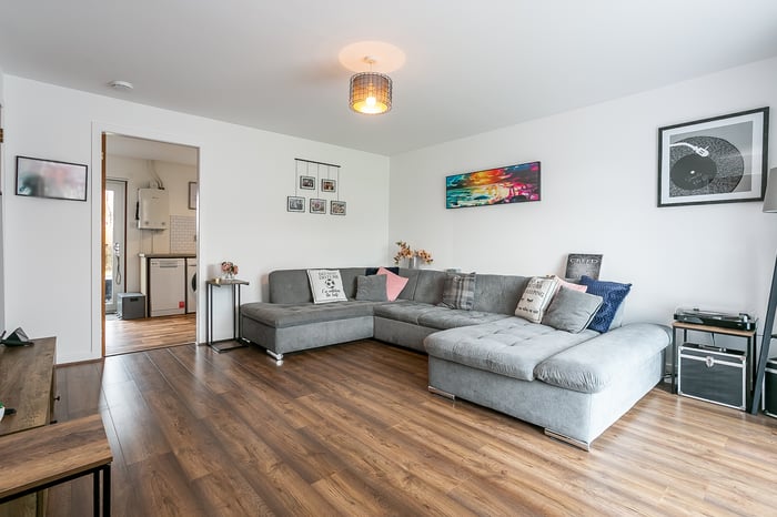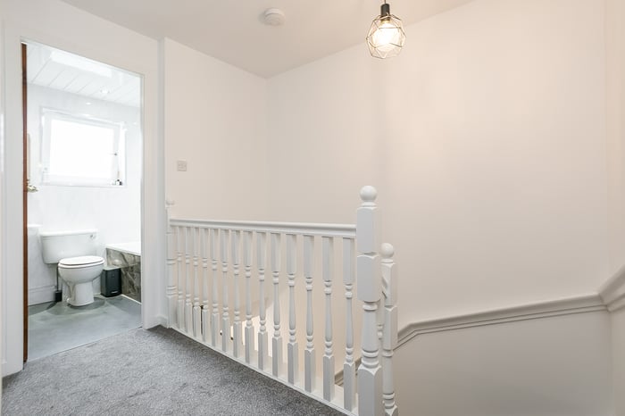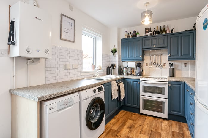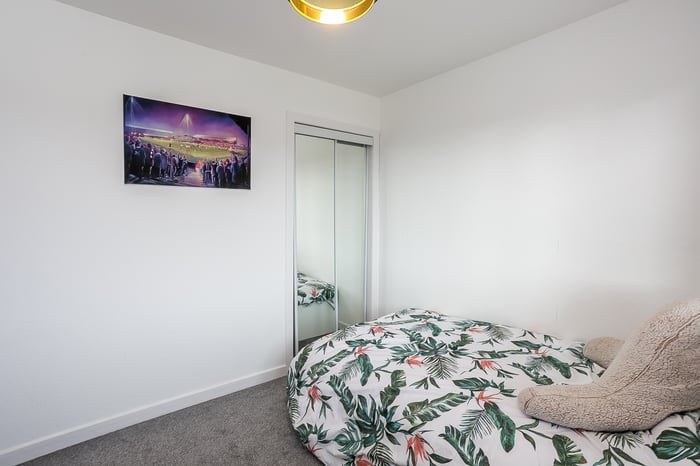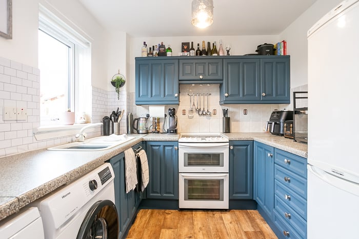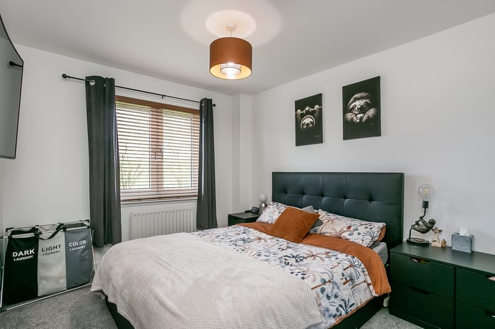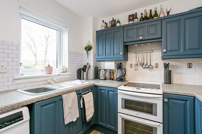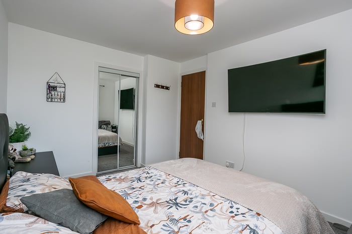 Fitted units and worktops include a tiled surround, a sink with a drainer; and plenty of space for freestanding appliances. On the upper floor, bedroom one is set to the rear, tastefully finished, with light decor, carpeted flooring, a built-in wardrobe with mirrored doors, and a wall-mount TV point.