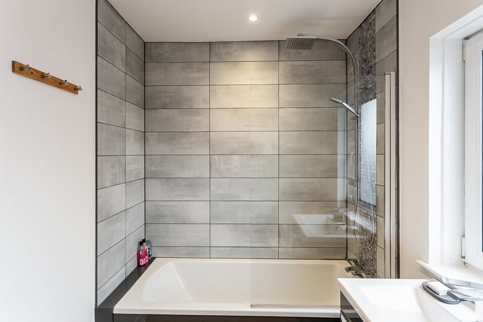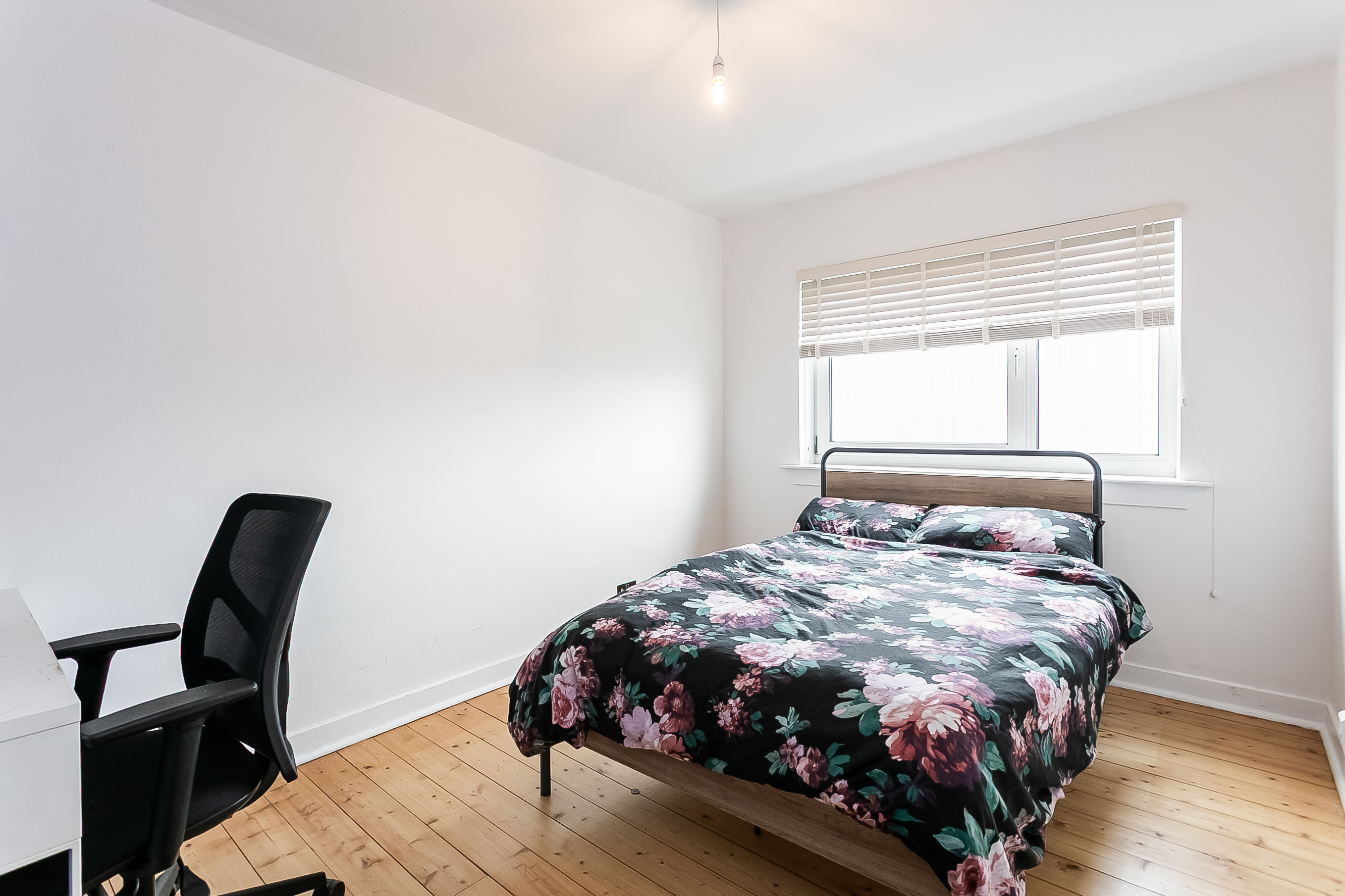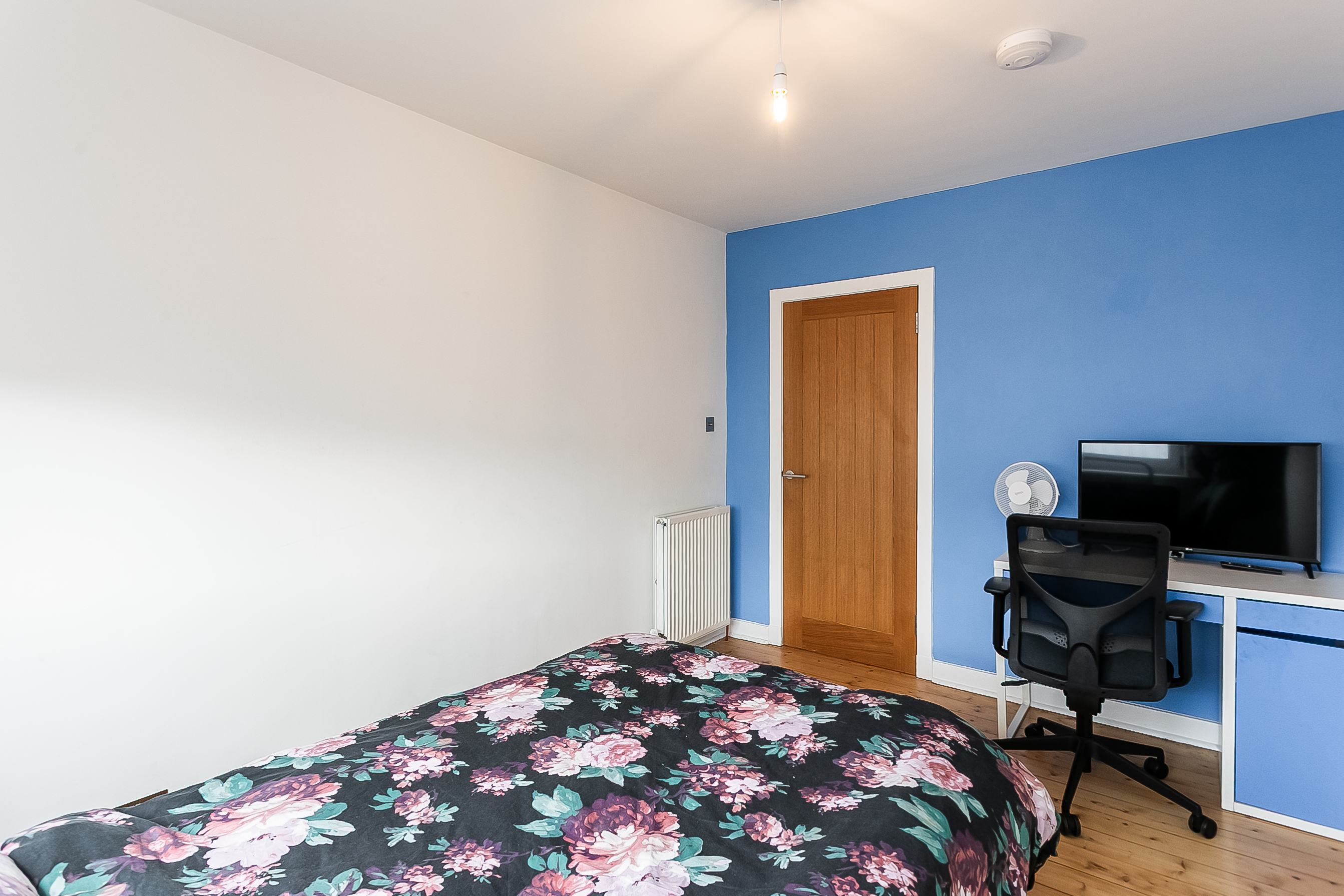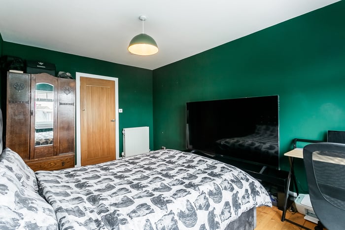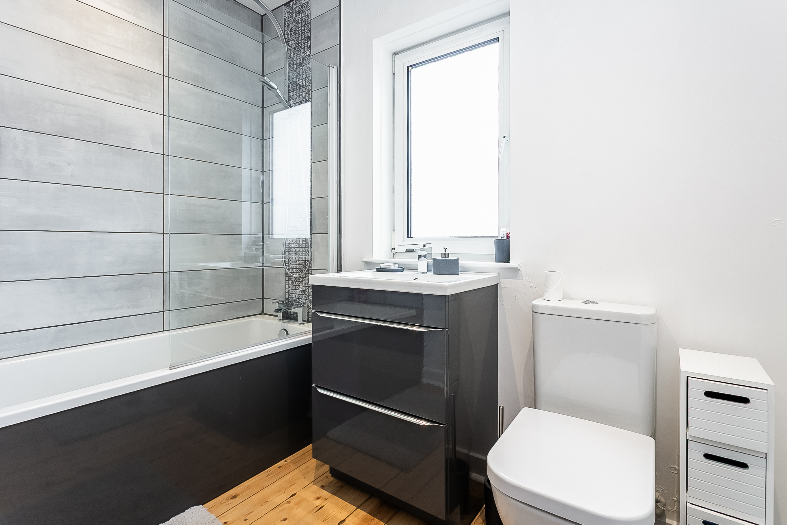 The second bedroom is also well-proportioned, making it ideal as a guest room, home office or additional sleeping space. Completing the property, the modern three-piece bathroom is finished with a tiled surround, spotlighting, a rainfall shower over the bath and a ladder-style radiator, creating a sleek and functional space.