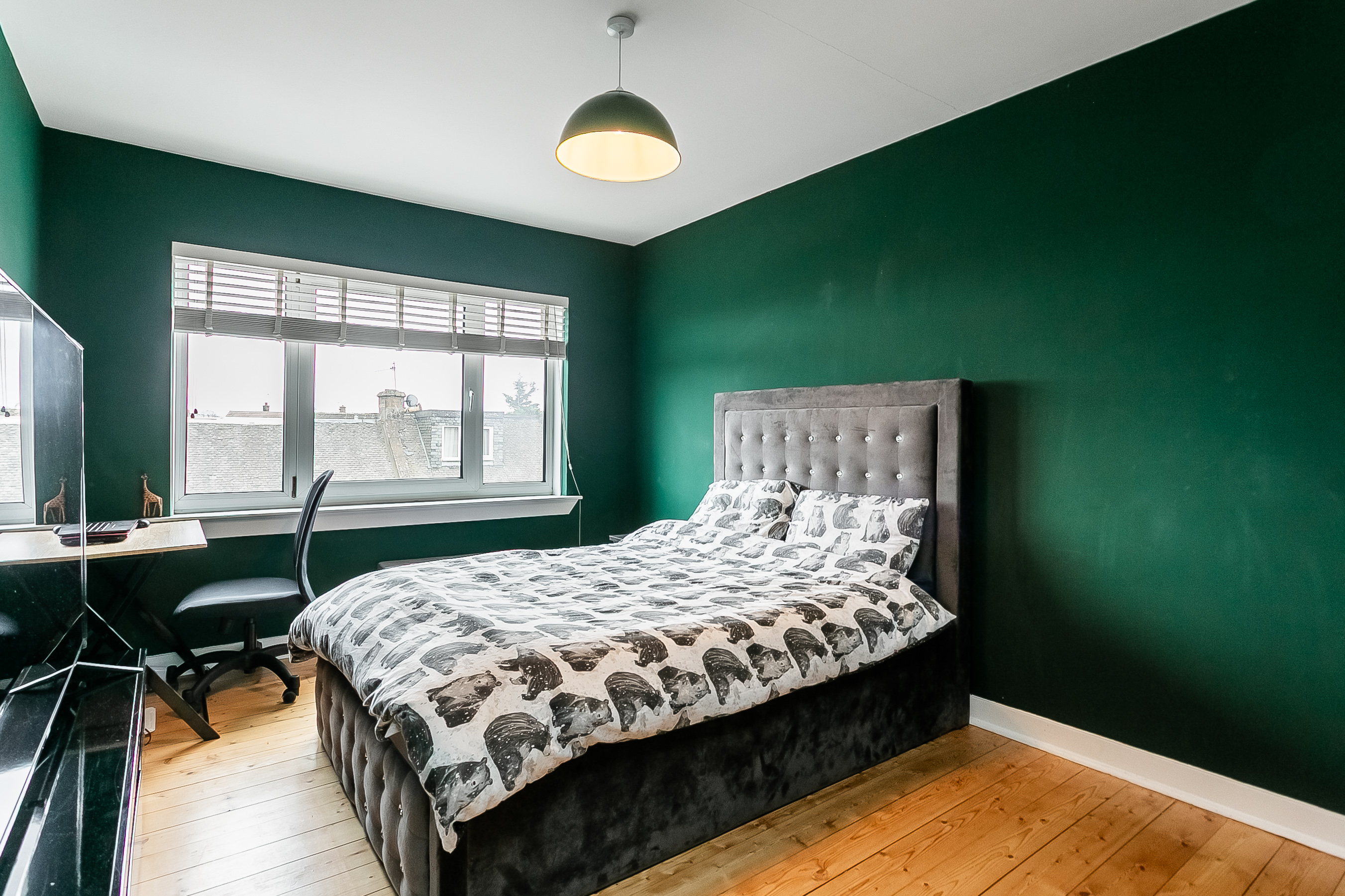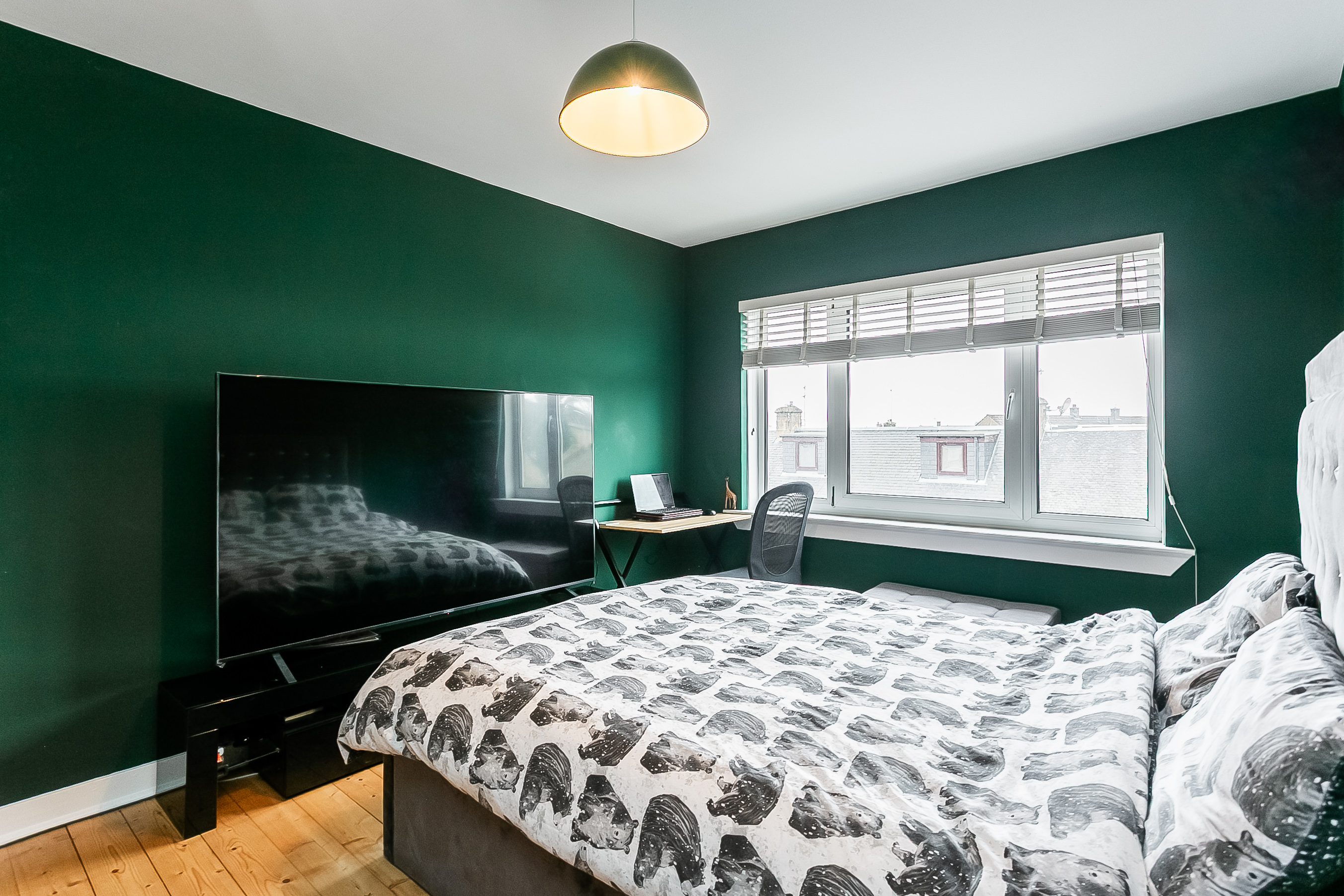 Integrated appliances include a washing machine, dishwasher, oven and gas hob, making it both practical and stylish. Located just off the entrance, the principal bedroom benefits from the continuation of the original wooden flooring and features a central light fitting, offering a bright and comfortable retreat with space for freestanding furniture.