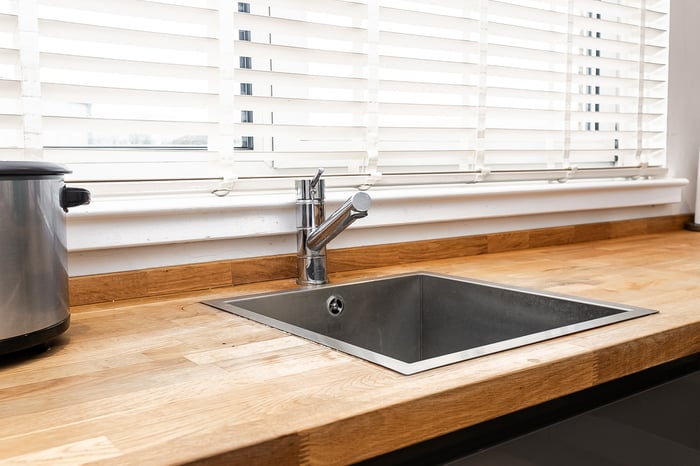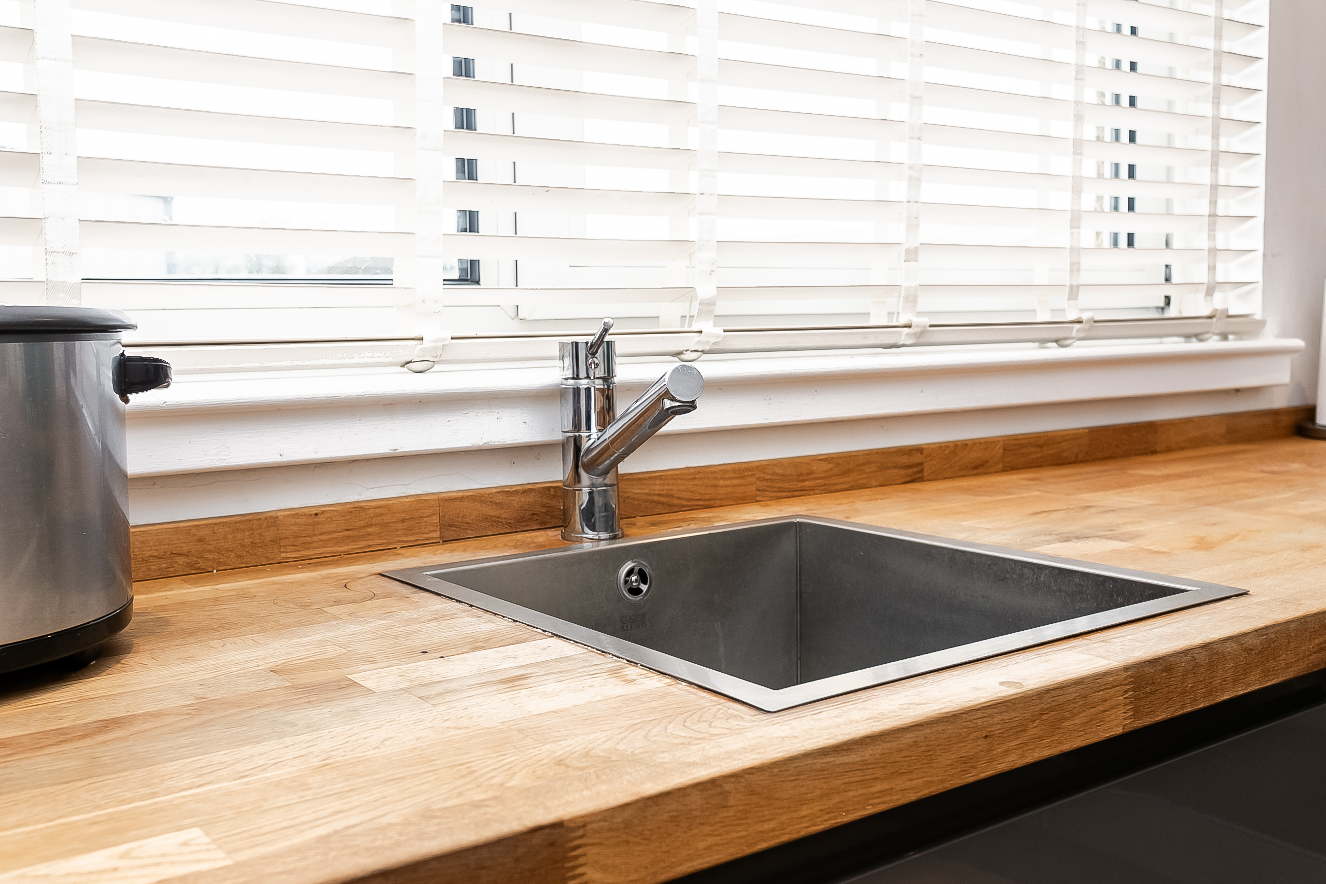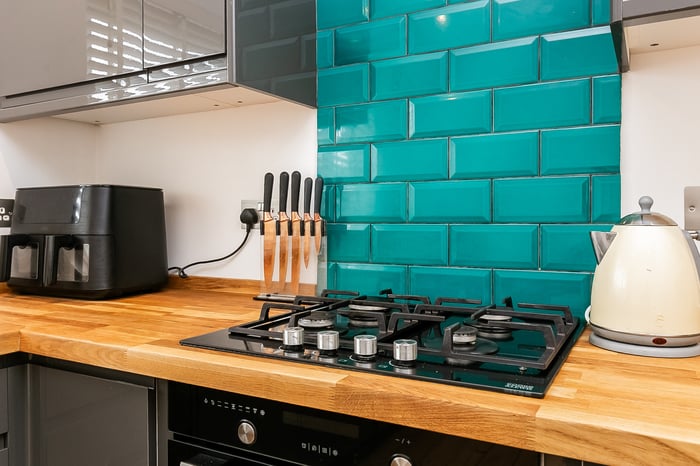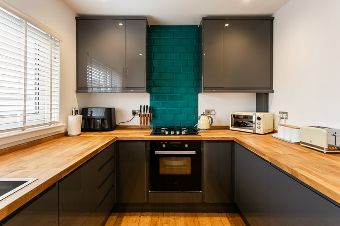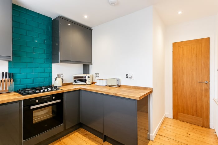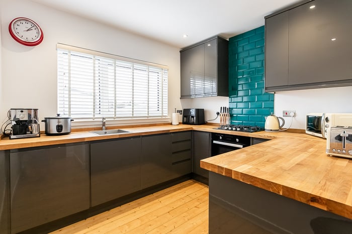 A large window allows for an abundance of natural light, giving the room an airy feel, and there is ample space for a full dining setup alongside comfortable lounge furniture. Situated across the hall, the modern fitted kitchen is well-appointed with hardwood worktops, a tiled splashback and contemporary spotlighting.