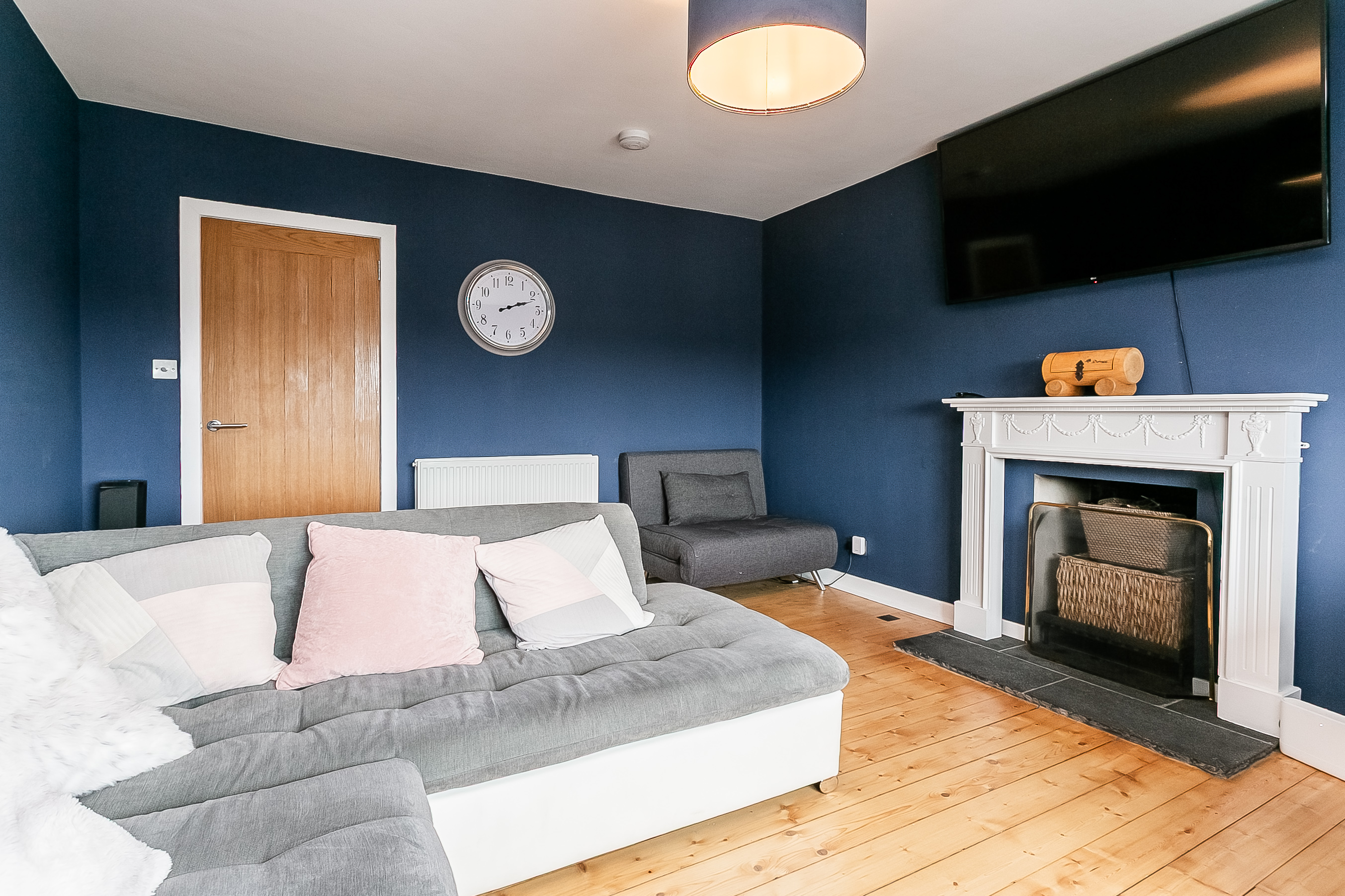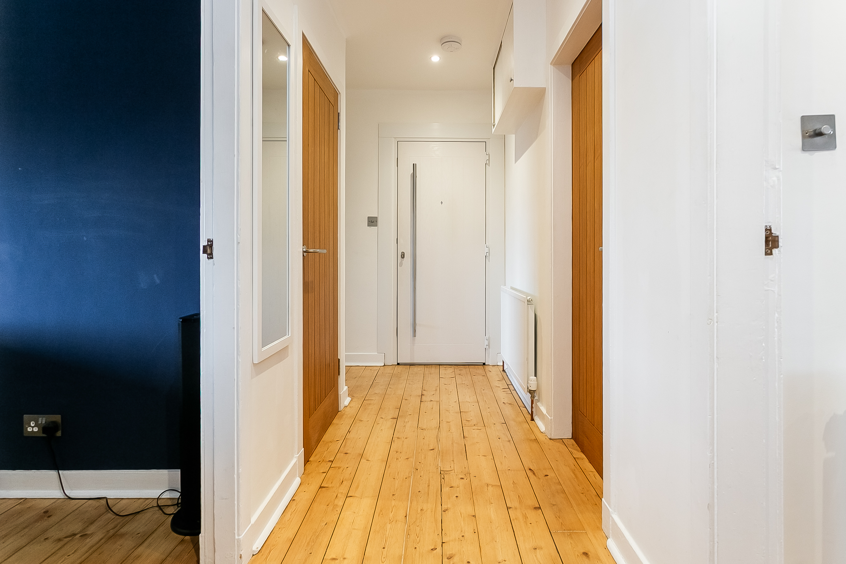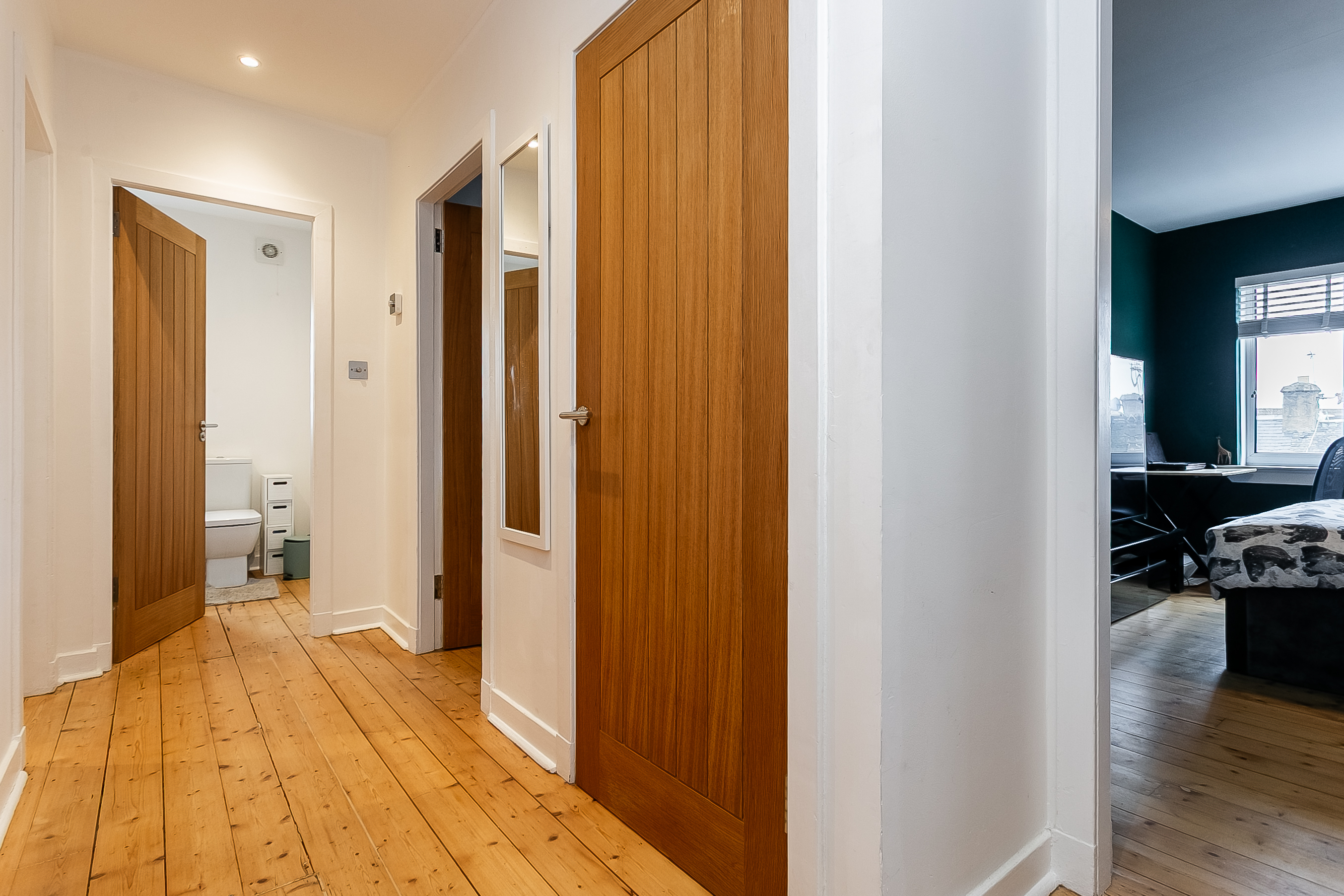 A bright and welcoming entrance hall sets the tone for the property, providing access to all rooms and featuring a convenient built-in storage cupboard to the right. The space is enhanced by stylish original wooden flooring, which continues throughout the home.