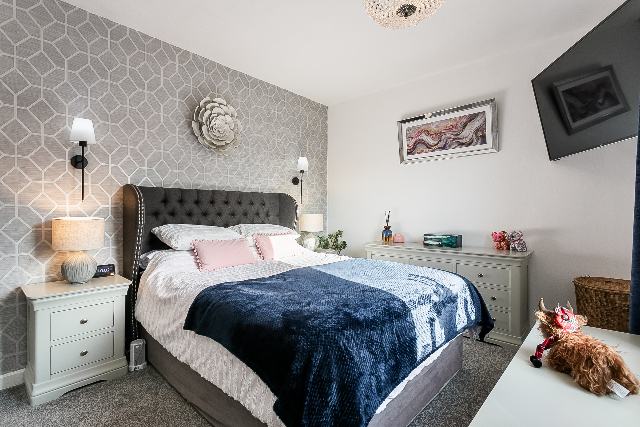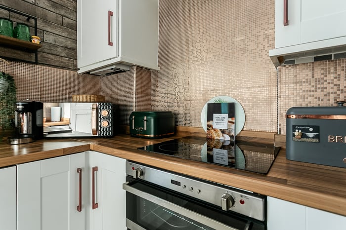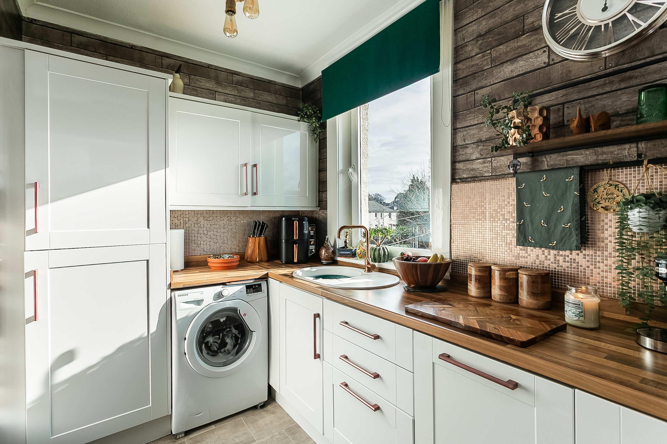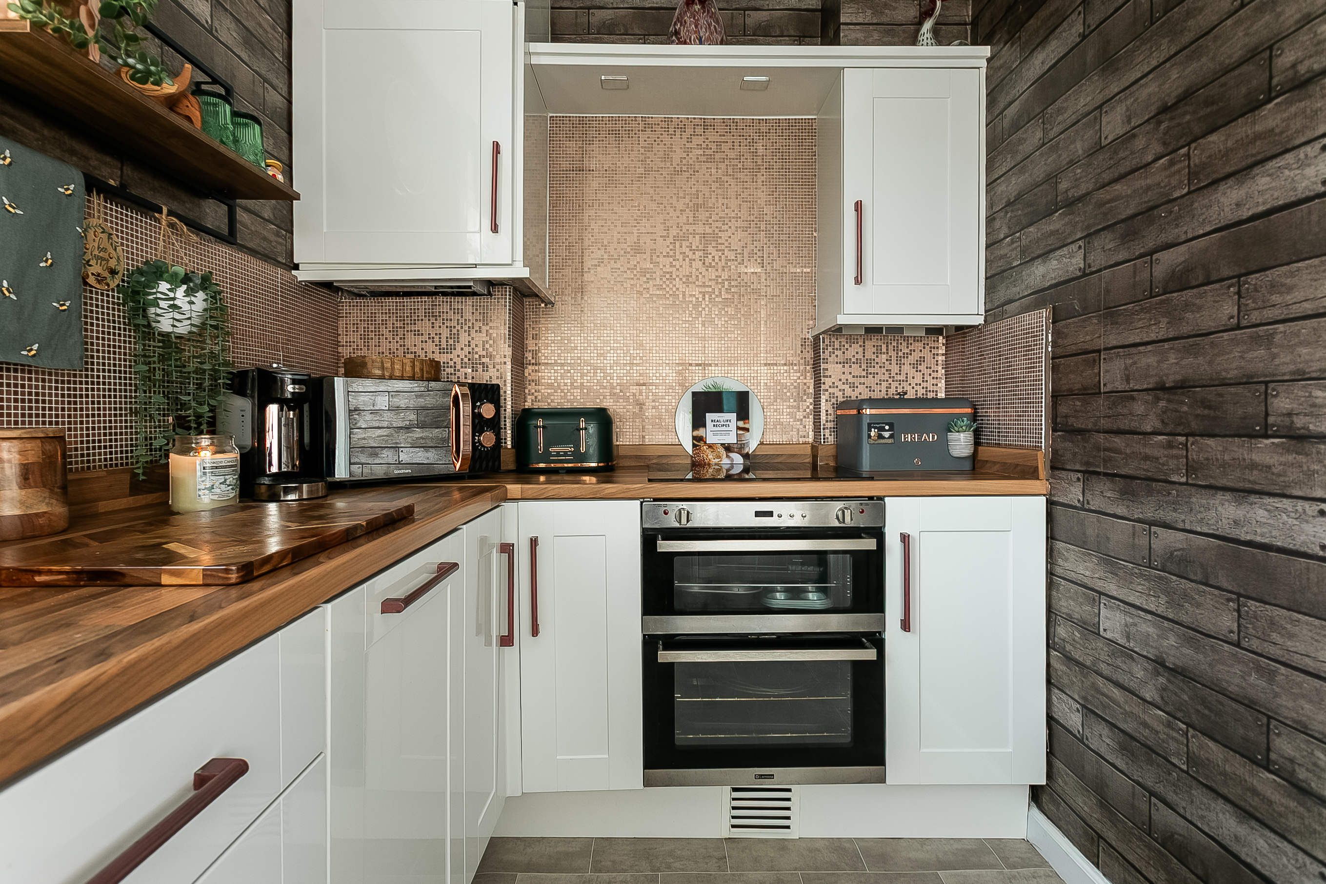 Accessed from the lounge via a stylish barn-style sliding door, the stylish kitchen features contemporary fitted units, wood-effect worktops, a sink with drainer and splashback surrounds. Integrated appliances include a double oven, electric hob, fridge/freezer and dishwasher.