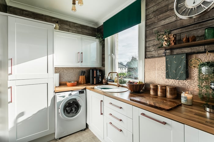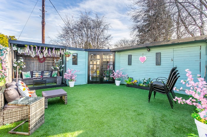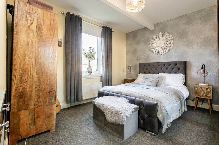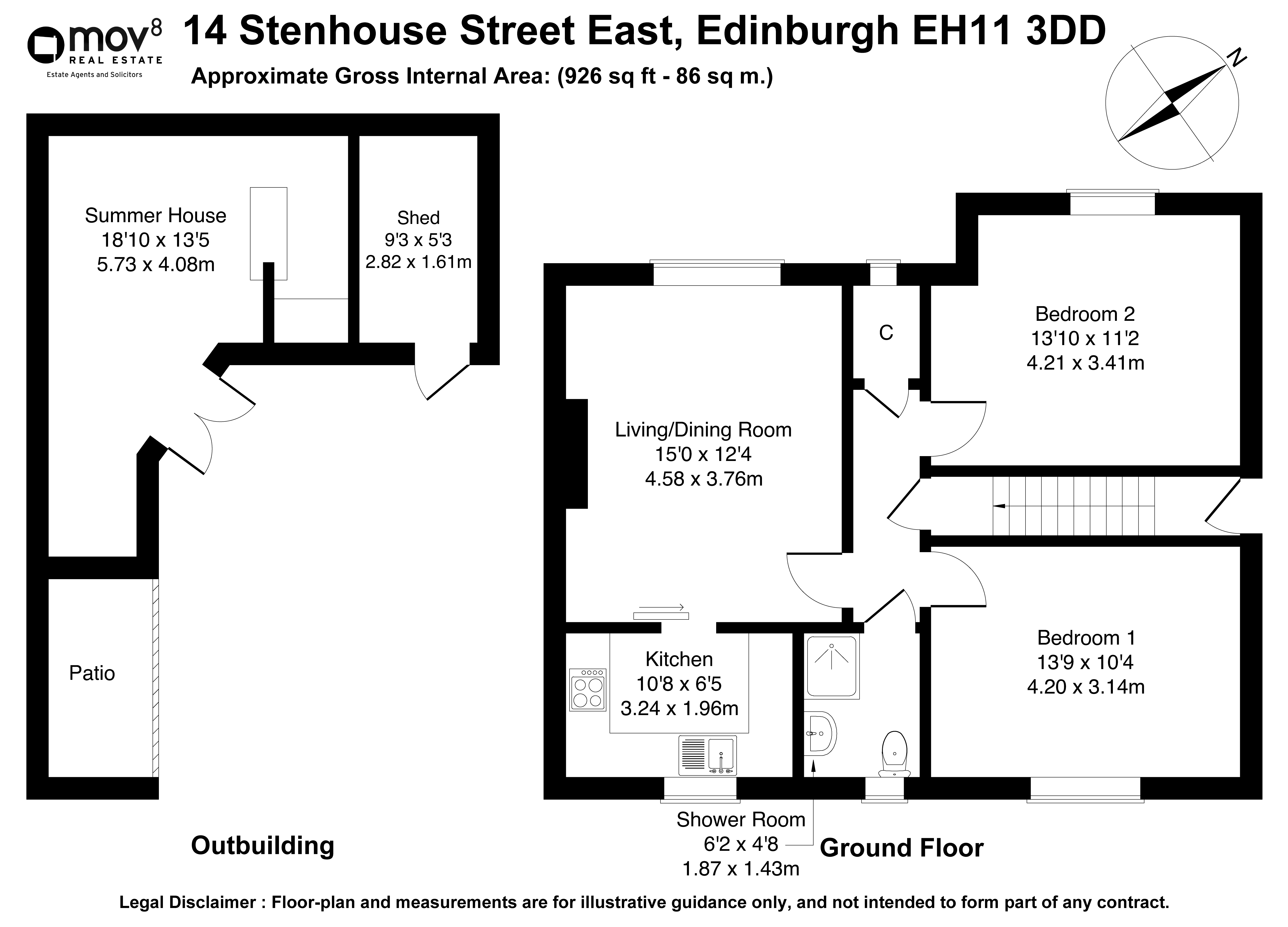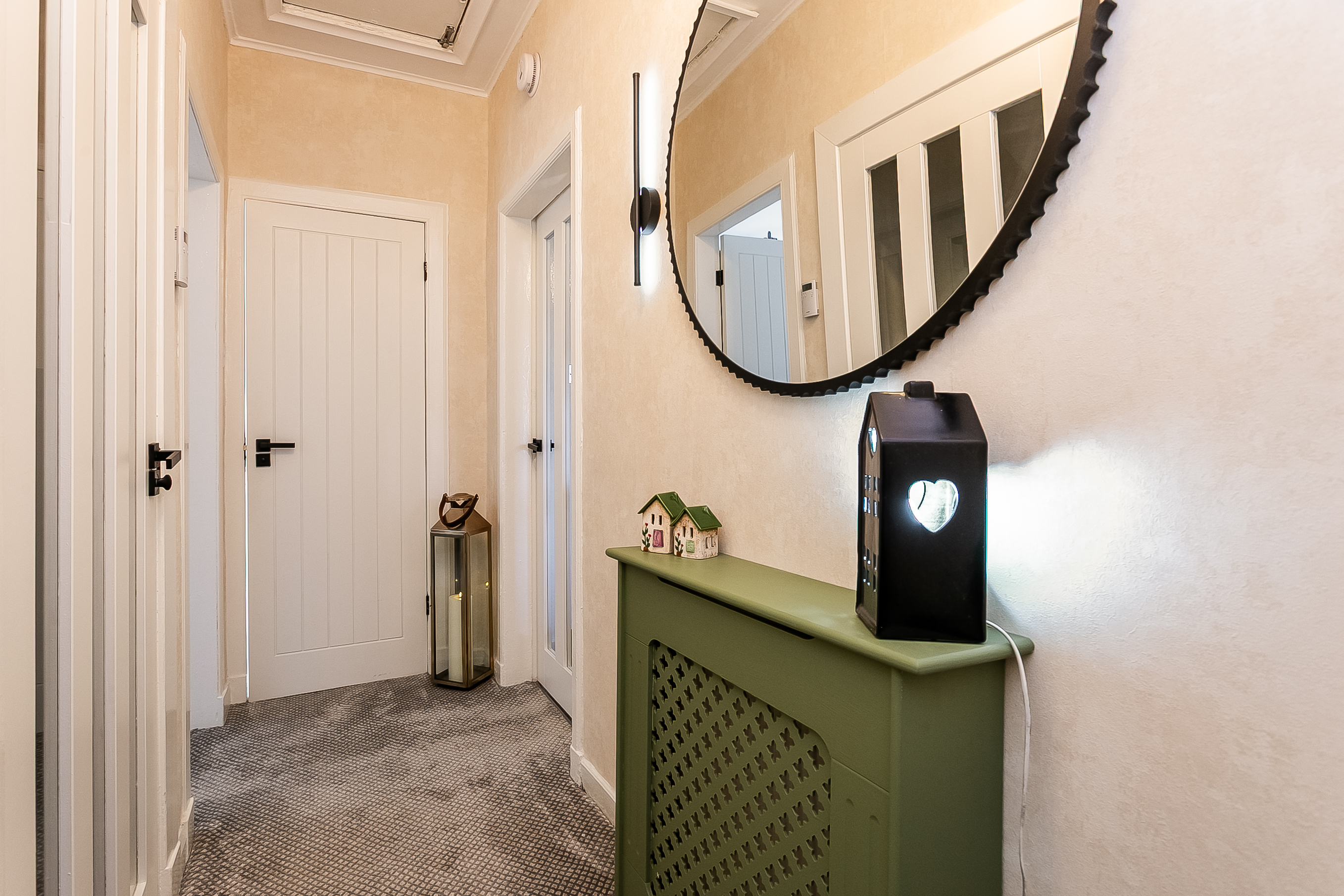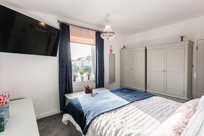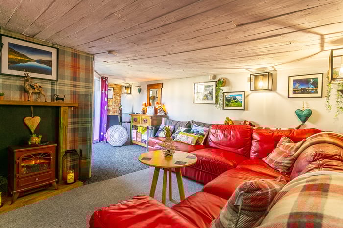 Beautifully presented, this charming, two-bedroom, main-door traditional upper villa boasts a private garden and a unique summer house, offering a versatile outdoor space. Located on a quiet side street in the popular Stenhouse area just west of Edinburgh city centre. The welcoming entrance is attractively decorated, with carpeted stairs leading to the main hallway, which provides access to the accommodation and includes a useful storage cupboard. Positioned to the front, the spacious living room offers ample space for both lounge and dining furniture, finished with carpeted flooring and an electric fireplace, creating a cosy focal point.