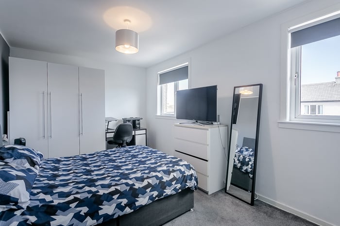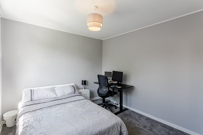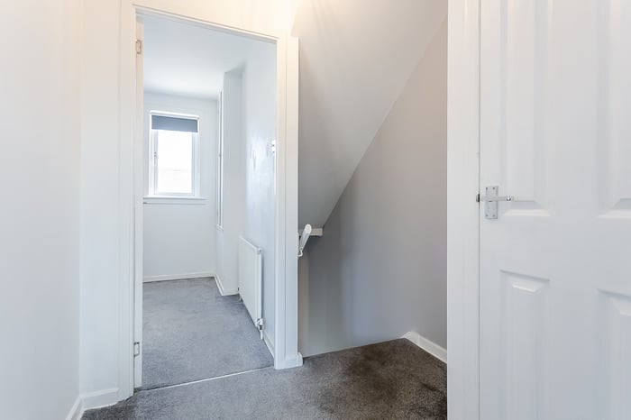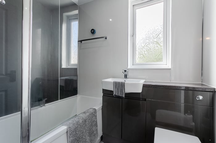 Carpeted stairs lead to the first floor, where you’ll find two further double bedrooms, both with large windows that fill the rooms with natural light. Completing the property is a modern bathroom featuring a three-piece suite, including a bath with an overhead shower and a ladder-style radiator.
