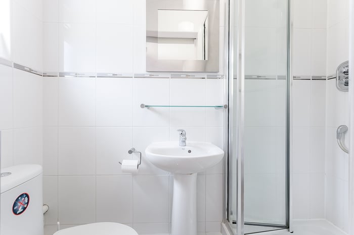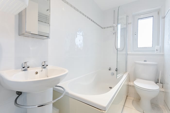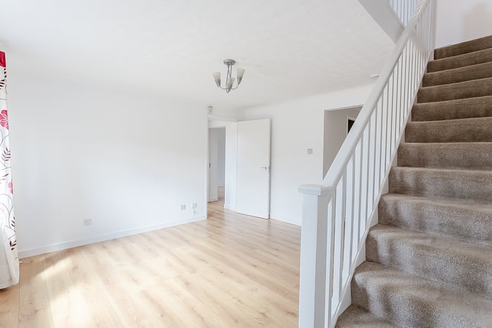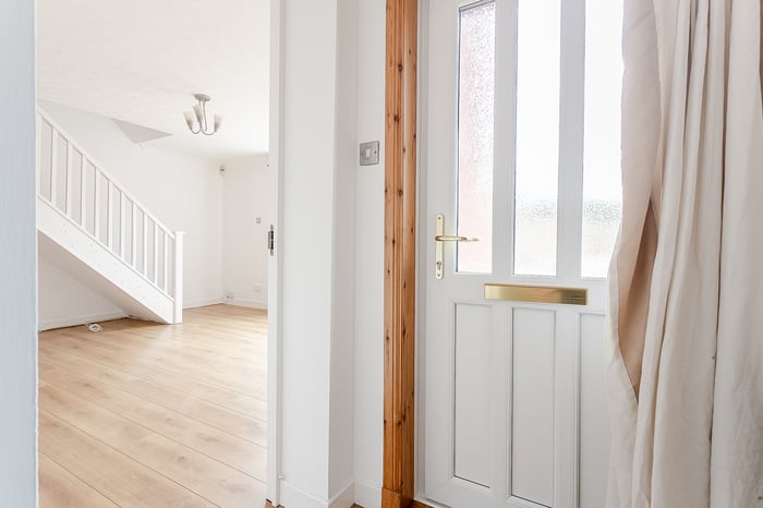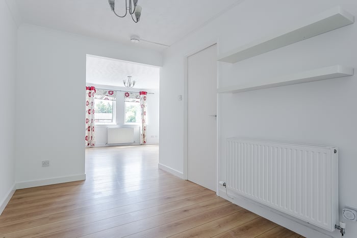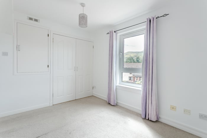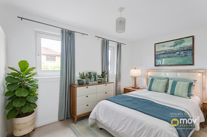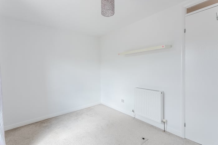 Upstairs, both double bedrooms have carpeted flooring with built-in cupboards for storage space and are completed with light decor. A family bathroom completed the first floor with a shower-over bath and a ladder-style radiator.