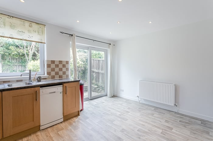 There’s ample room for a dining table, making it perfect for both everyday living and entertaining. Sliding doors open directly onto the garden, effortlessly blending indoor and outdoor spaces.