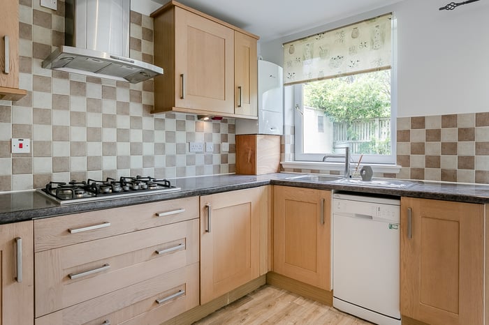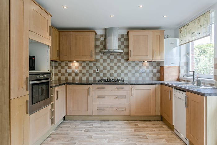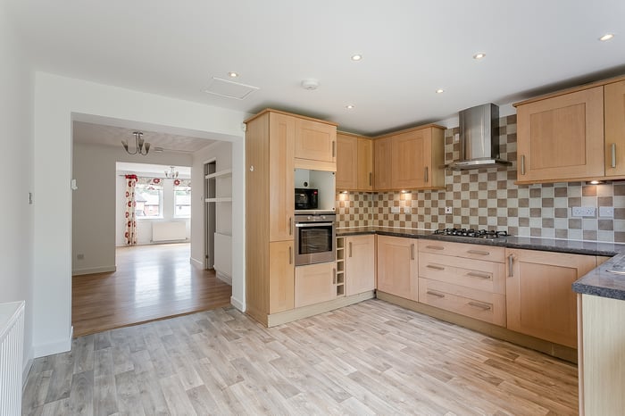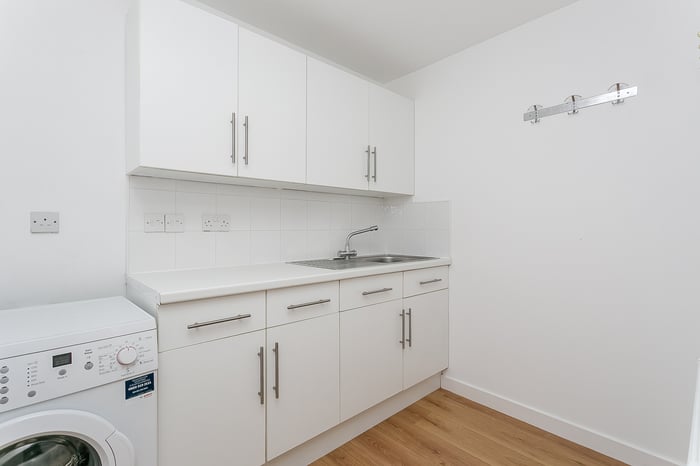 The home benefits from a separate utility room offering additional space for laundry appliances and generous storage options. The kitchen continues the wood-effect flooring and is fitted with a modern suite, complete with granite-effect countertops, a sink with a drainer, and a tiled splashback.
