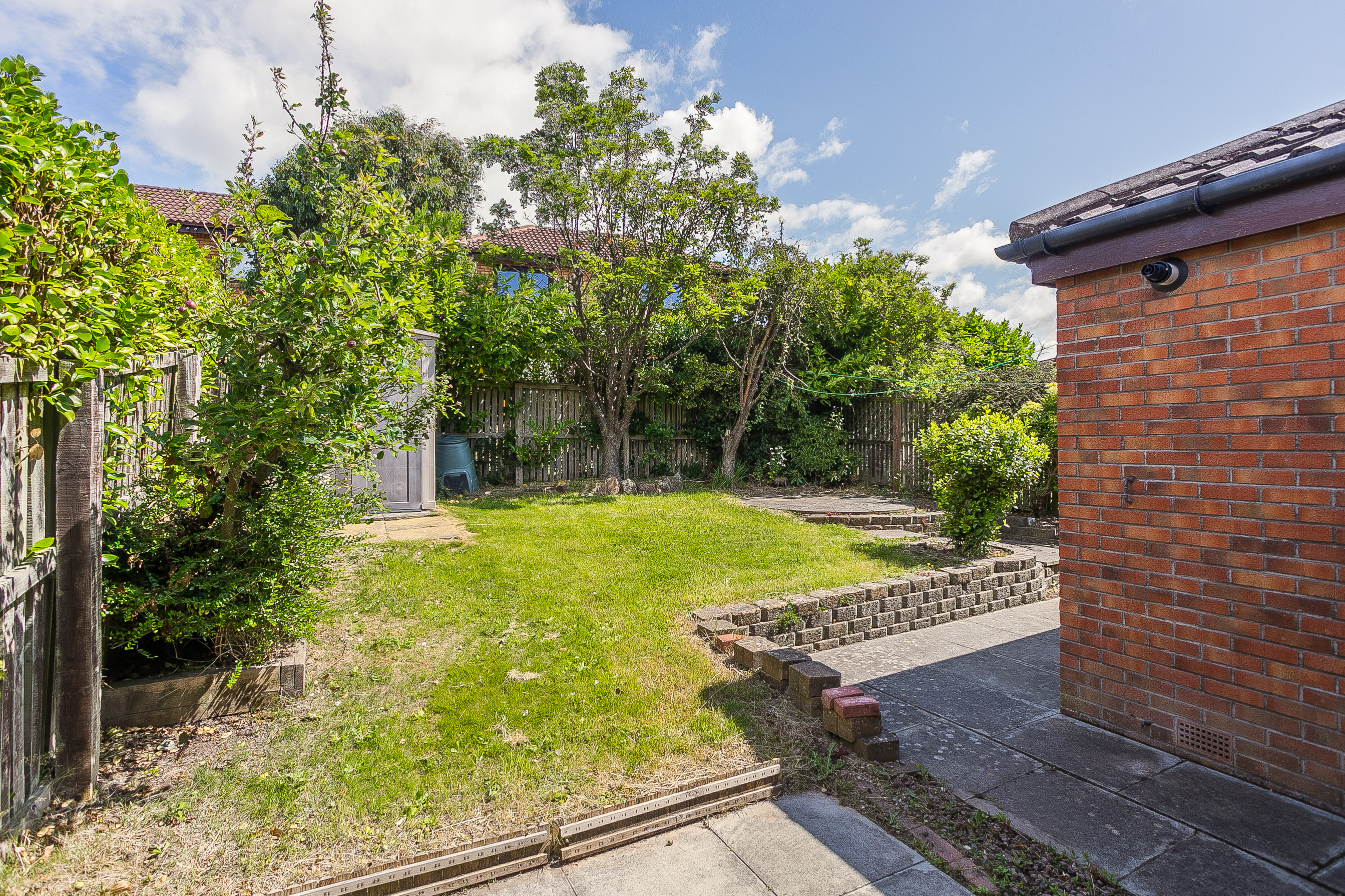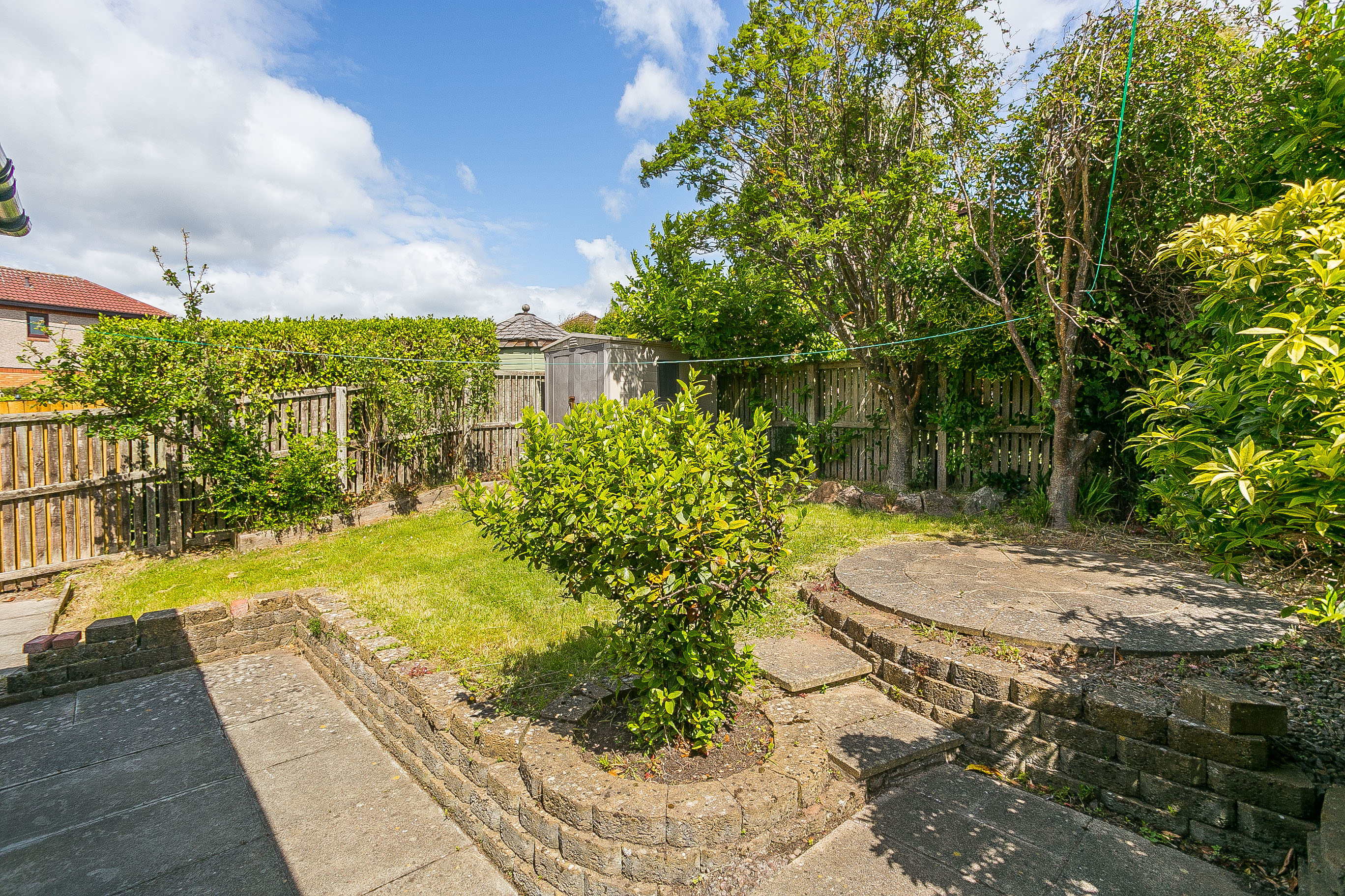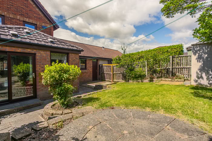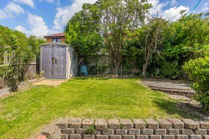 • With a residents' parking to the front, a good-sized enclosed rear garden features a lawn, established shrubbery, paved patios, and a store shed.