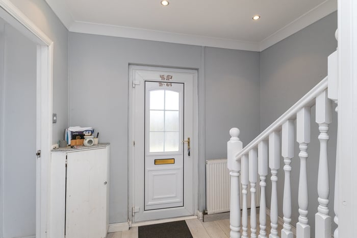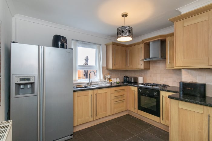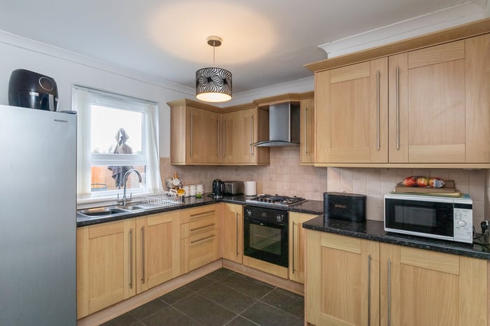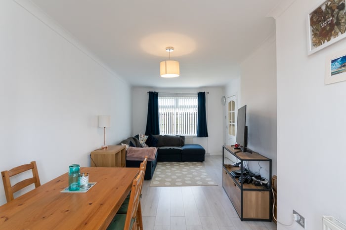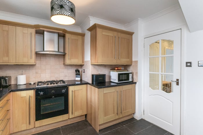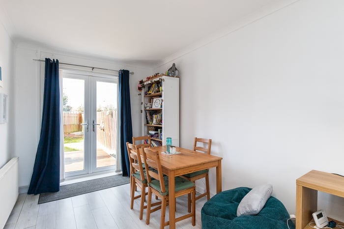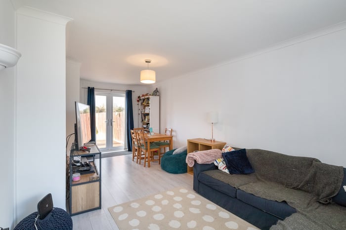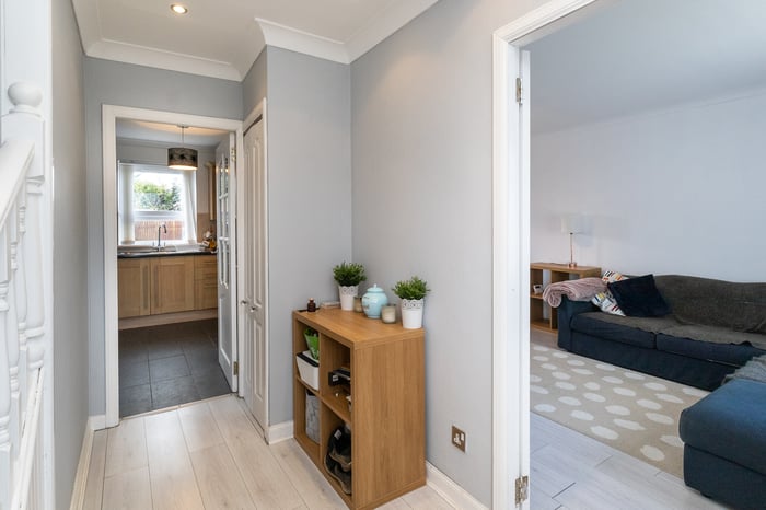 A welcoming entrance hall affords access to the stairs leading to the upper hall, the rear-set kitchen and the dual-aspect living room which features wood effect flooring continuing from the hall, a central light fitting, a dining area to the rear and French patio doors accessing the south-facing garden. Also with garden access, the kitchen is fitted with wall and base units, stone effect worktops, a sink with drainer and a tiled surround; with appliances including an integrated oven and a gas hob with an extractor hood, and ample space for freestanding appliances.