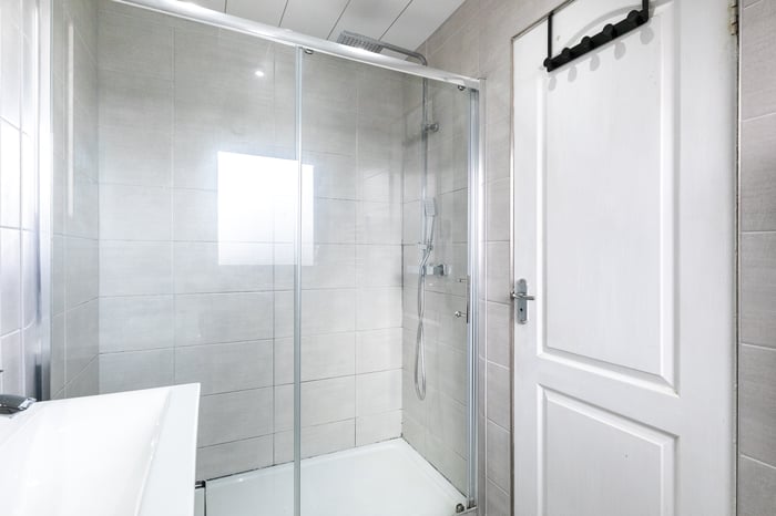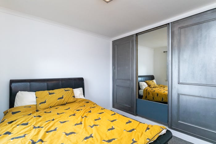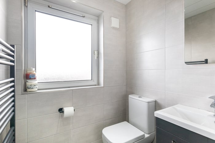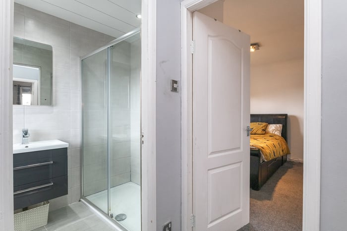 On the upper floor, bedroom one is set to the front with carpeted flooring and two windows allowing plentiful natural light; whilst bedroom two overlooks the rear garden, and also features carpeted flooring and a built-in wardrobe. Completing the accommodation, the stylish shower room is fitted with a modern suite including a large shower cubicle with a rainfall showerhead, tiled flooring and splash walls, spotlighting and a ladder-style radiator.