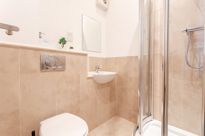 Both bedrooms feature carpeted flooring and built-in cupboard storage for flexible use, with the master bedroom benefiting from a Juliet balcony and an en-suite bathroom complete with a three-piece suite, shower cubicle, and ladder-style radiator. A shared family bathroom completes the property, offering a three-piece suite with a shower over the bath and a matching ladder-style radiator.