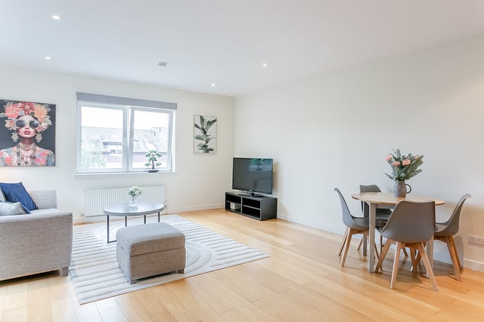 Upon entry, you’re welcomed into a hallway providing access to all rooms, leading into the open-plan living, dining, and kitchen area—ideal for entertaining, with wood-effect flooring, large windows flooding the space with natural light, light décor, and a Juliet balcony. The kitchen is neatly finished with modern worktops, paneled splashbacks, a sink with drainer, ample cupboard space, and integrated appliances including an oven, five-ring gas hob with canopy, fridge/freezer, and dishwasher.