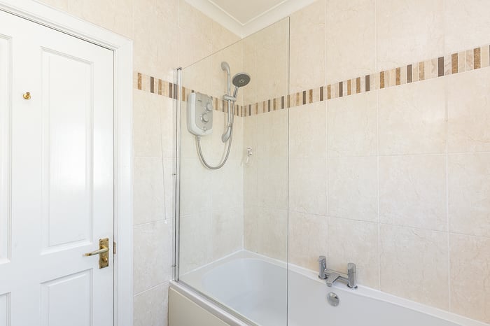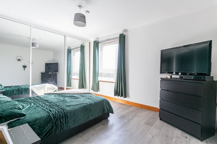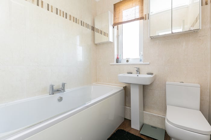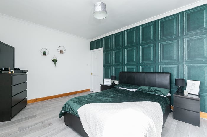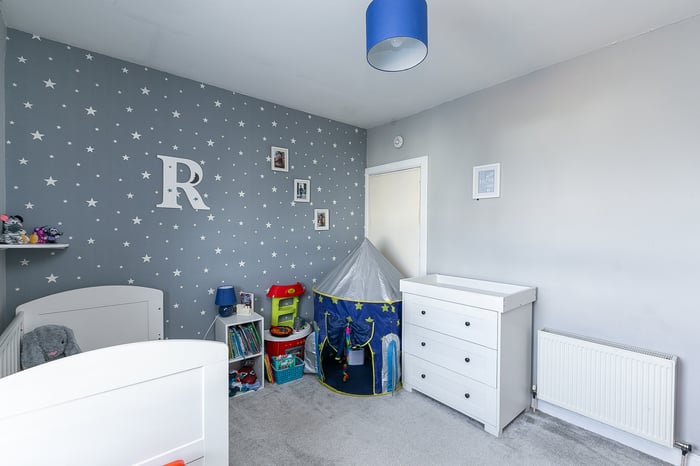 Whilst the main bedroom includes mirrored, fitted wardrobes and modern, wood-effect flooring, the second, flexible bedroom includes built-in storage and enjoys garden views. Completing the accommodation, a bathroom is fitted with a white, three-piece suite, a shower-over-bath, a chrome, ladder-style radiator and tiled splash walls.