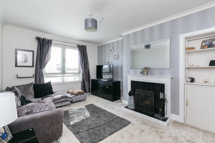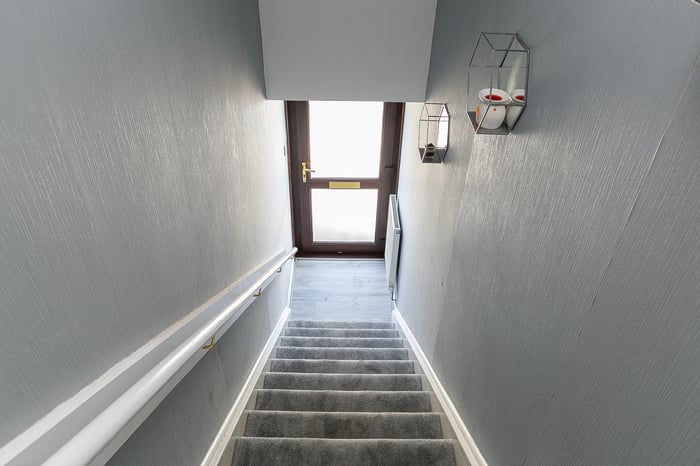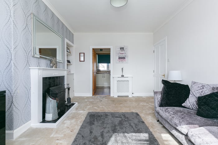 Tastefully presented and spacious, two-bedroom, traditional upper villa, with a private garden and multi-vehicle driveway. Located in an established residential area of the popular seaside town of Carnoustie, Angus. A welcoming entrance staircase and hall, finished in contemporary grey decor and carpeting, leads to all rooms within the home.