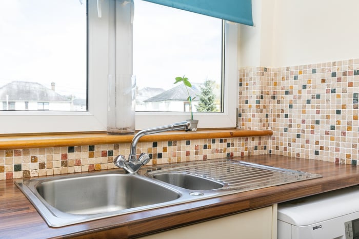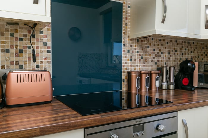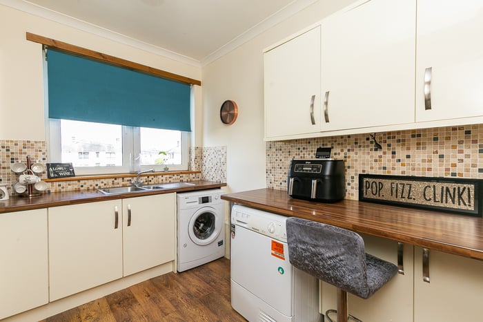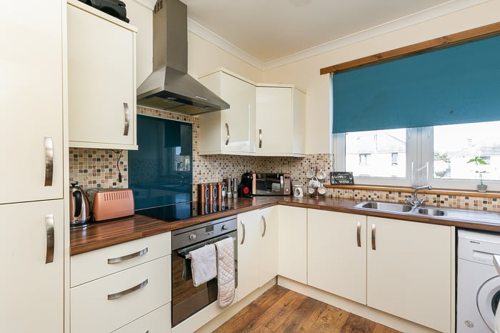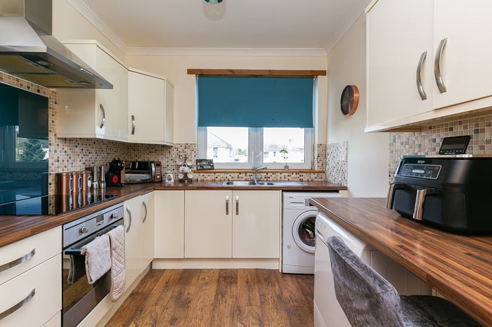 Appliances include an integrated oven, ceramic hob, stainless-steel canopy and fridge/freezer, whilst plumbing and space are available for freestanding appliances. Set to either aspect, two well-proportioned double bedrooms display the tasteful presentation of the living space.