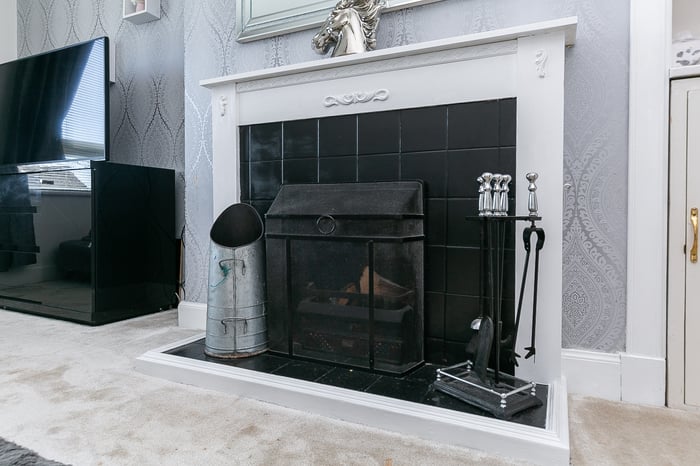 Benefiting from a south-facing aspect, a tastefully presented living room, with a feature fireplace, enjoys generous dimensions and offers a versatile floorplan for freestanding furniture. Conveniently leading off the living room, a kitchen is fitted with stylish units, wood-effect flooring and worktops, mosaic-tiled splashbacks and a breakfast bar.
