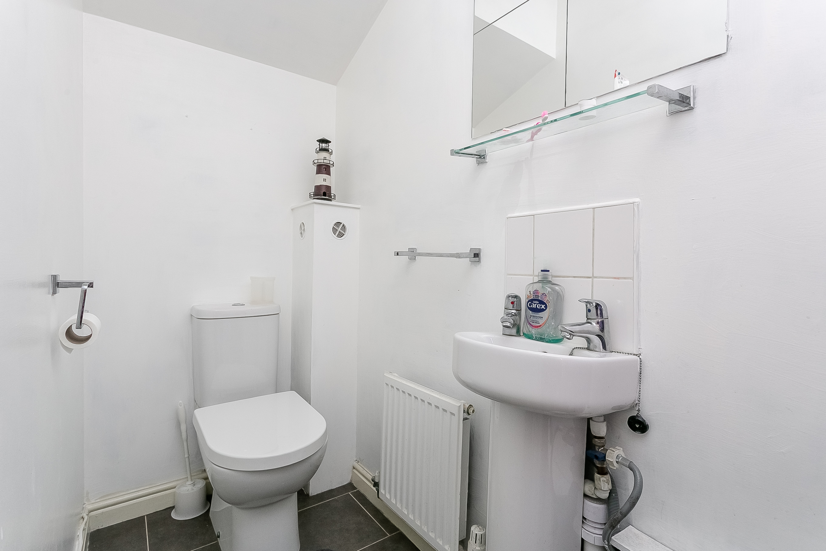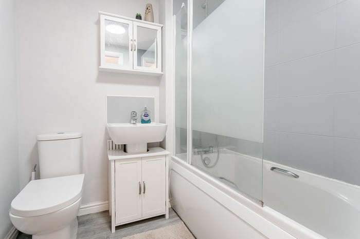Upstairs, the property offers two carpeted double bedrooms, each enjoying built-in storage and ample space for freestanding furniture, and positioned to opposite aspects for added privacy. The accommodation is completed by a family-sized bathroom, fitted with a modern three-piece suite, shower over the bath, and tiled splashback walls.