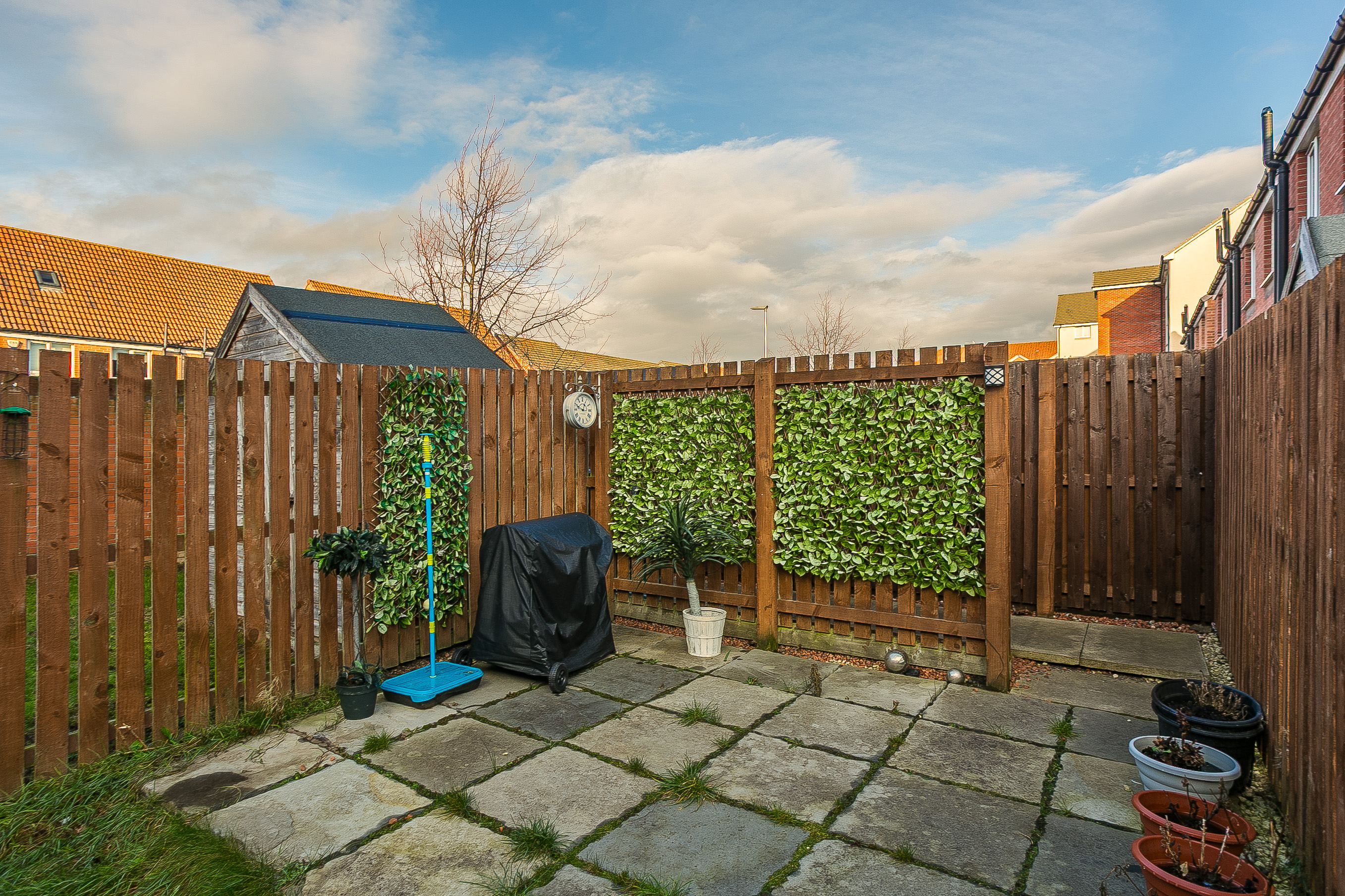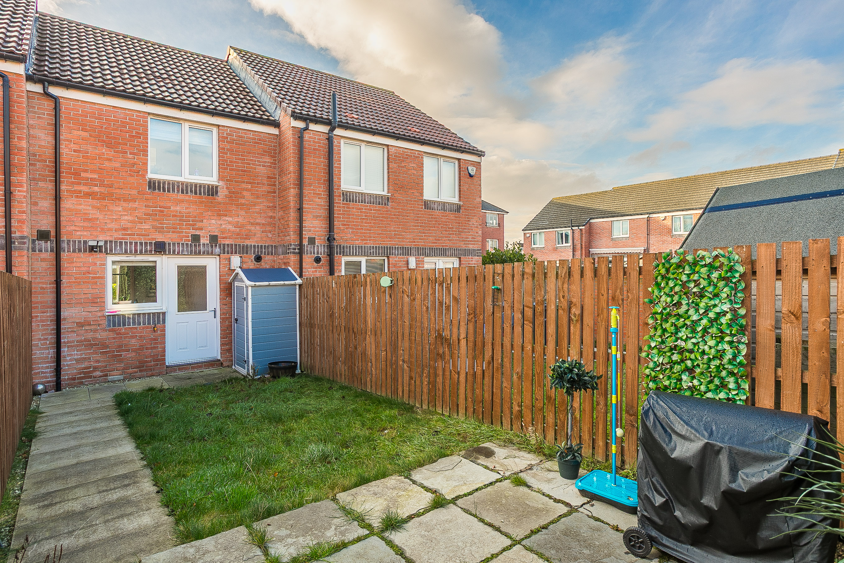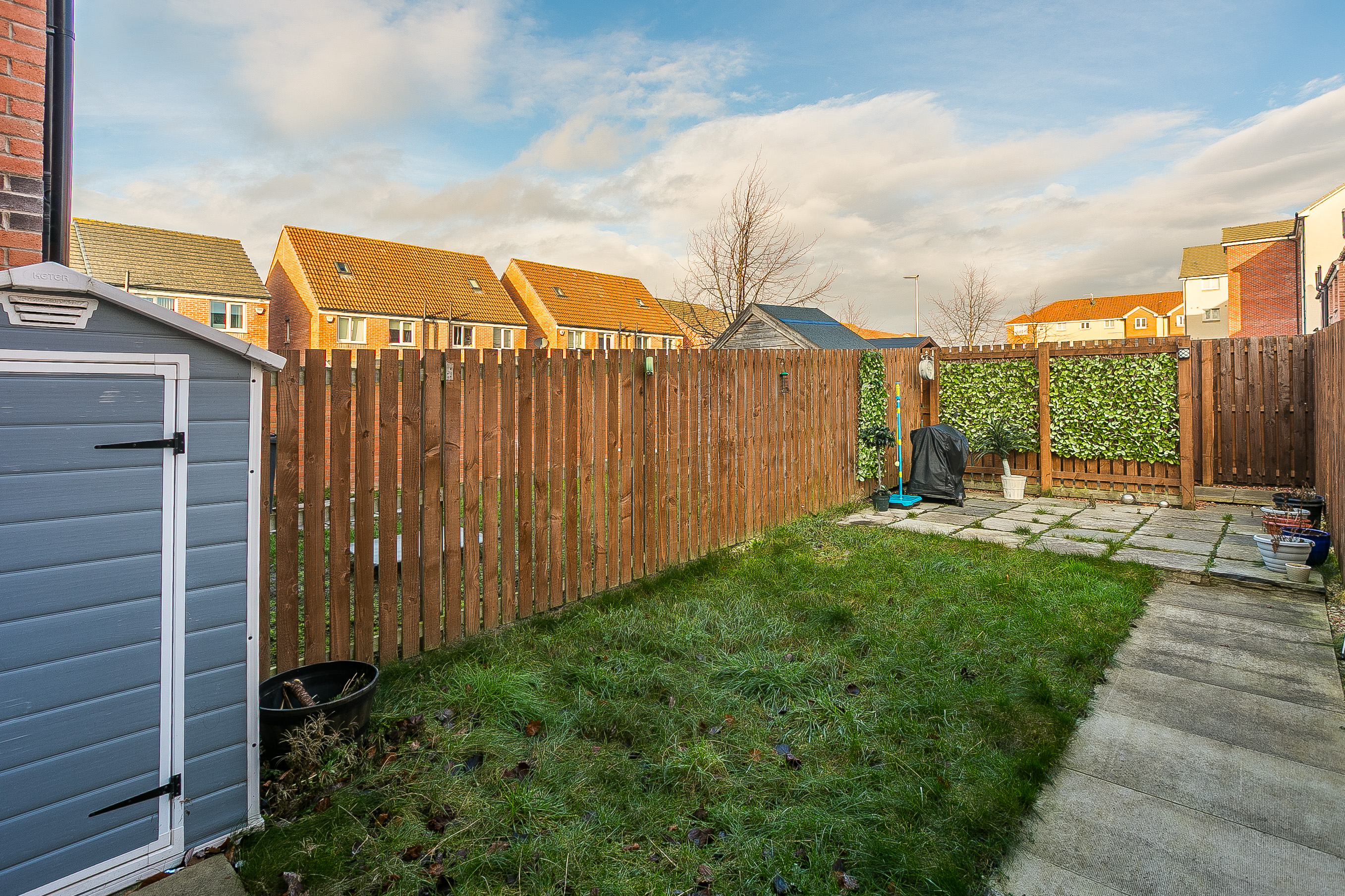 • Externally, the property boasts an enclosed rear garden featuring a lawn, a patio, a storage shed, and a paved path to a rear gate giving access to the residential parking.