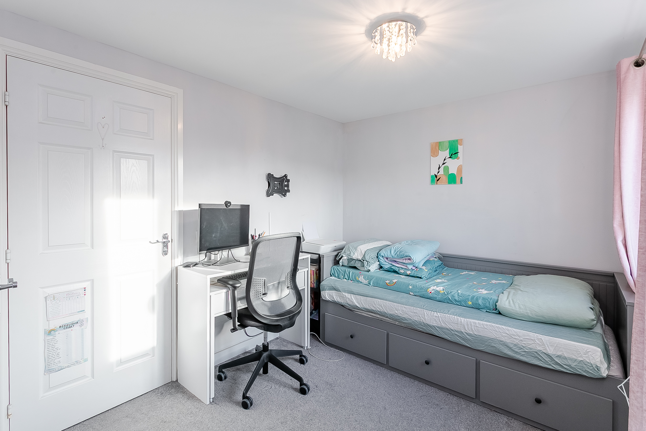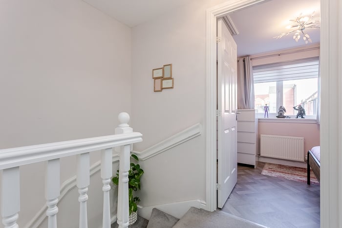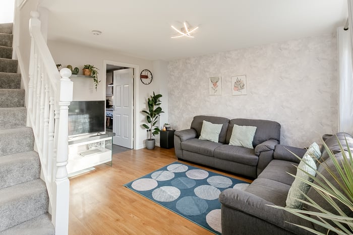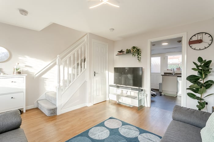 The welcoming entrance leads into a bright, front-facing living room, flooded with natural light from its south-facing aspect. Finished with light decor and luxury flooring, the space also benefits from a convenient under-stair storage cupboard and a TV point.