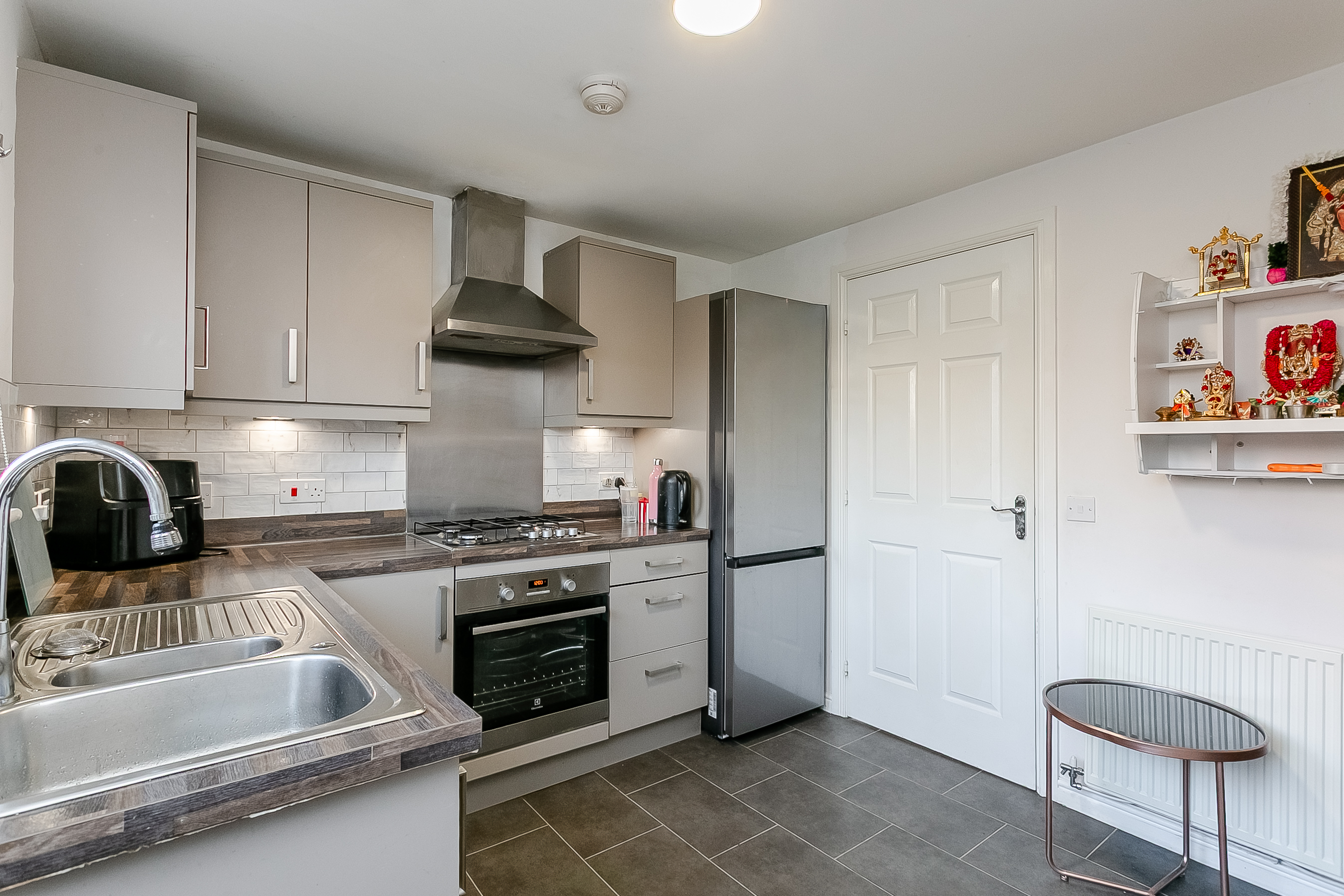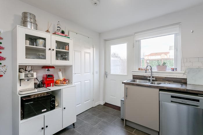 Off the lounge, the well-sized kitchen is fitted with contemporary units and wood-effect worktops, complemented by a tiled surround, a sink with a drainer and a spray-pull tap, and an excellent range of appliances including a gas hob, oven, dishwasher, washing machine, and fridge/freezer. A door provides direct access to the rear garden, while a WC with ample storage completes the ground floor.