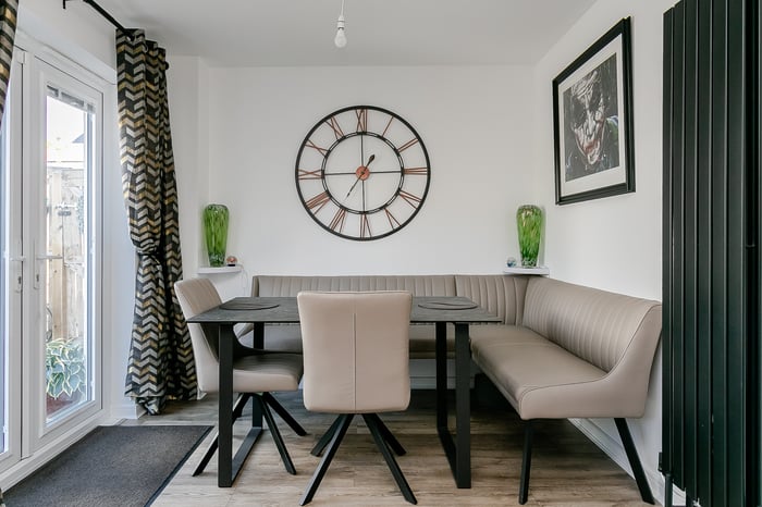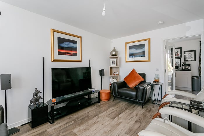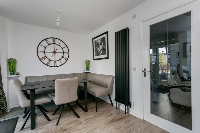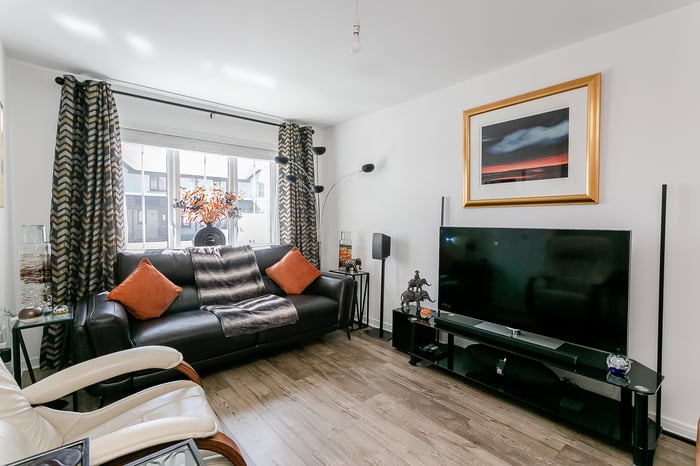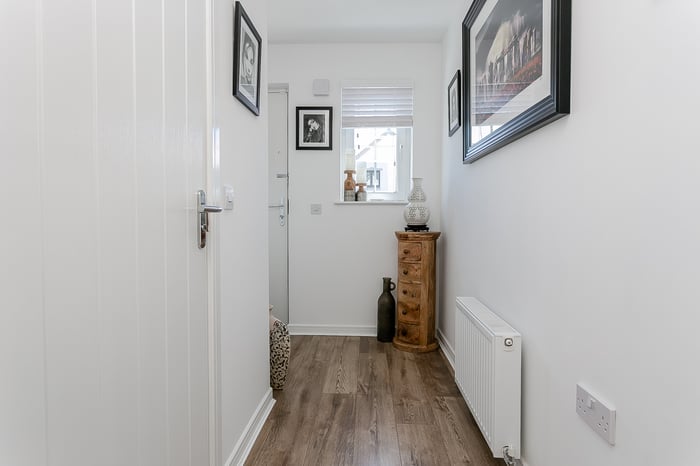 This immaculately presented three-bedroom end-terrace home boasts private gardens and an allocated double parking bay, making it an ideal choice for families and professionals alike. Nestled within a peaceful, modern and growing residential development in Glenrothes, Fife.  A bright and welcoming entrance hall, complete with wood-effect flooring, leads to a convenient ground-floor WC and flows seamlessly into the front-facing lounge.