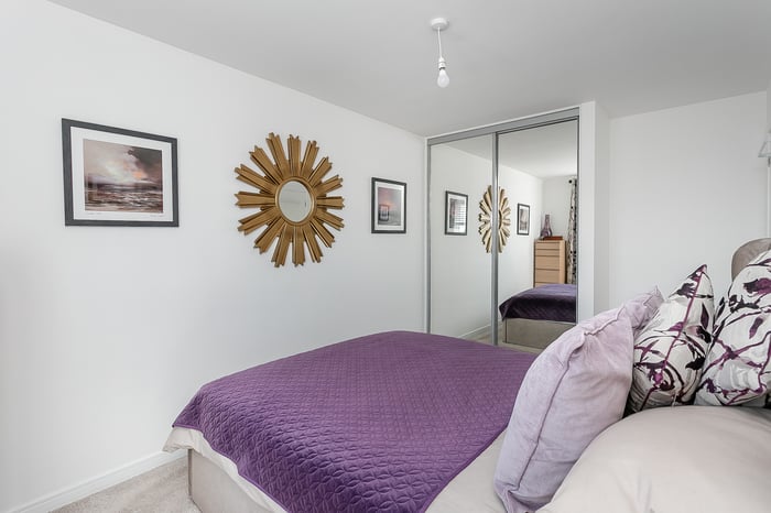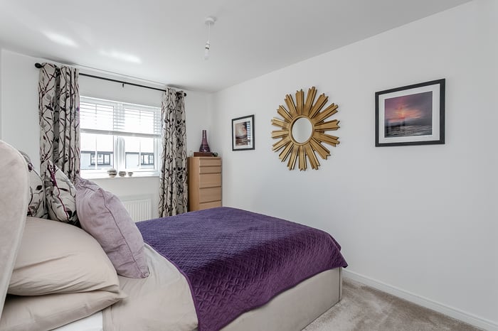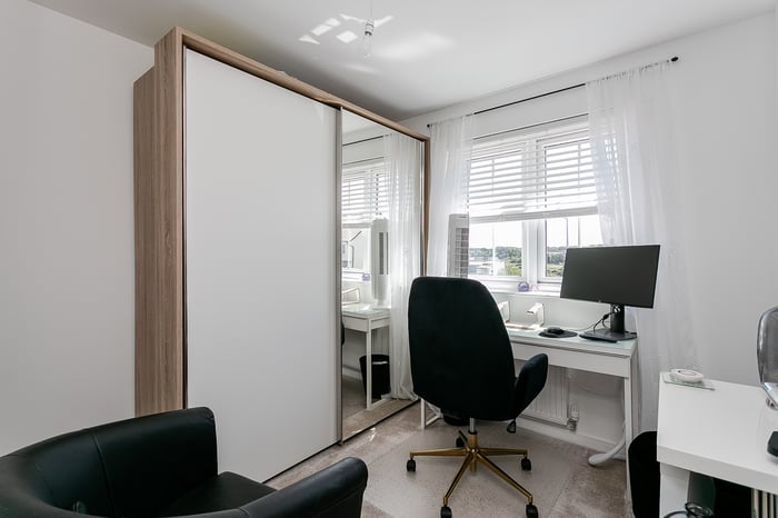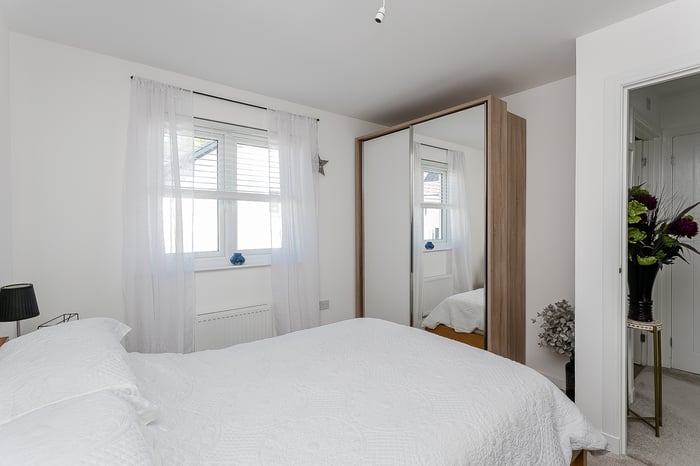 Upstairs, the generously sized main bedroom is positioned to the front, featuring carpeting, neutral décor, and a mirrored built-in wardrobe. Two further bedrooms are set to the rear and front, both are similarly well-finished with carpeted flooring.