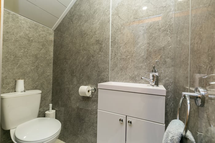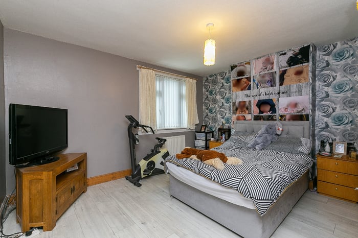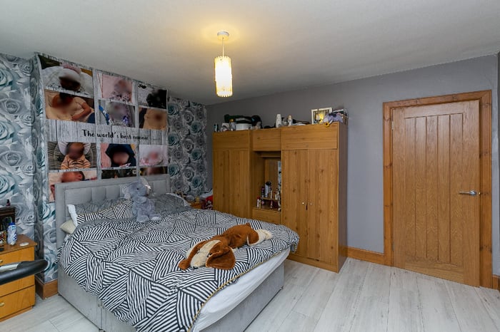 On the upper floor, the hall features further storage provision with two storage cupboards; whilst two double bedrooms are set to the front, similarly well-sized and finished with wood effect flooring, with the wardrobe in bedroom one included in the sale, and bedroom two featuring eaves storage. Completing the accommodation, set to the rear, the bathroom is fitted with a three-piece suite, an electric shower unit over the bath and modern panelling.