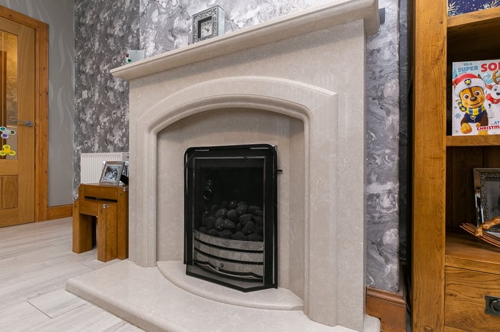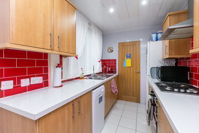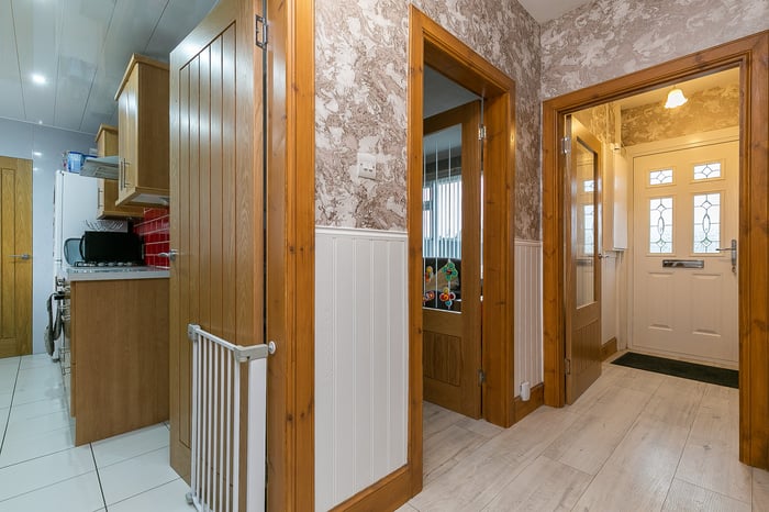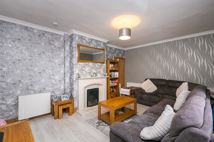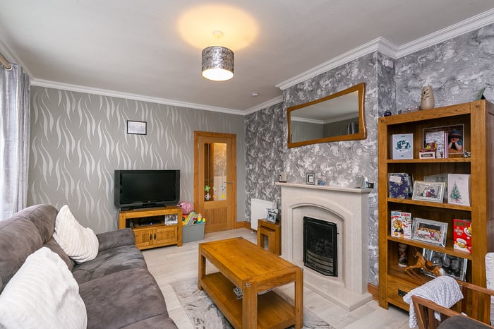 The entrance vestibule opens into the hall which gives access throughout the ground floor, with wood effect flooring extending into the front-facing living room which features ample space for lounge furniture and a tasteful fireplace surround. Set to the rear with a door to the garden, the kitchen is fitted with wall and base units, modern worktops, a tiled surround and a sink with drainer.