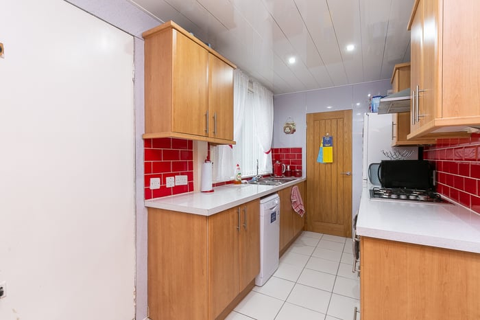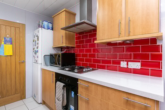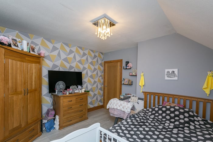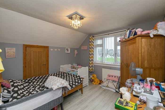 Appliances include an integrated oven and gas hob with an extractor hood; a freestanding fridge/freezer, dishwasher and washing machine housed in the utility cupboard. Also, set on the ground floor a flexible bedroom is currently used as a dining room, and features two built-in cupboards; whilst a convenient WC is set to the rear, internally off the hall.
