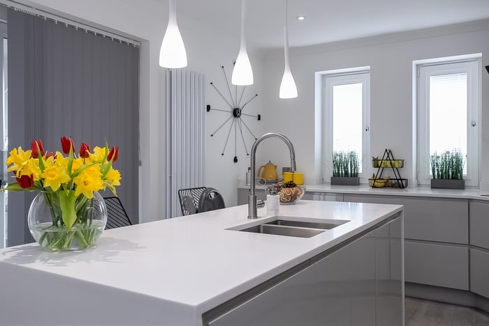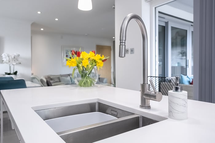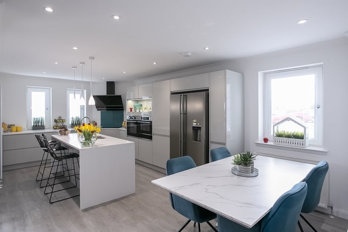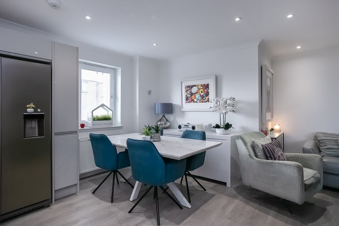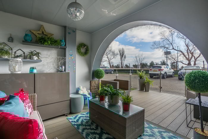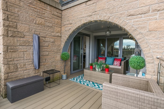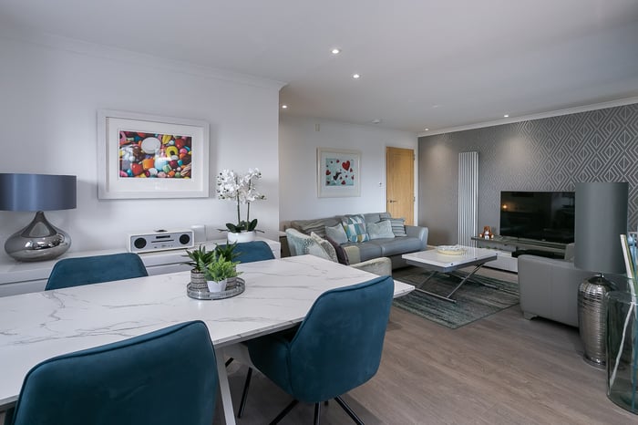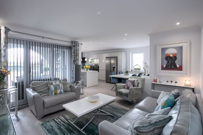 Fitted with modern, wood-effect flooring, an impressively proportioned, open-plan, kitchen, living and dining room benefits from plenty of natural light from generous, dual-aspect glazing and opens onto a large, south-facing, decked terrace. The stylish reception area offers ample, versatile space for freestanding lounge and dining furniture and flows into a kitchen, fitted with contemporary white units, Minerva worktops and a central, breakfasting island.