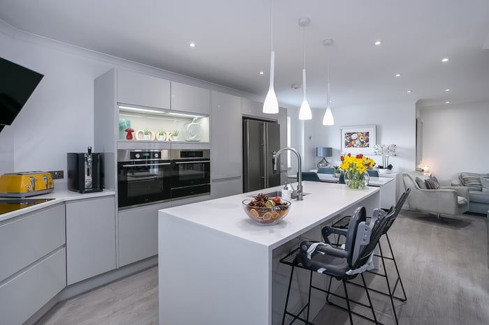 Integrated appliances include an oven, a microwave, an induction hob, a dishwasher, a fridge/freezer, a warming drawer and a washing machine. Three well-presented, double bedrooms are fitted with integrated wardrobe storage, with the master bedroom further benefiting from a modern, en-suite shower room and bedroom three including additional, bespoke, full-height storage.
