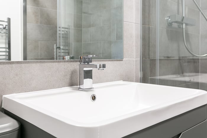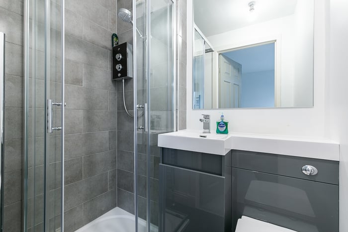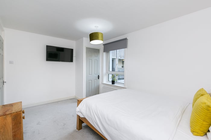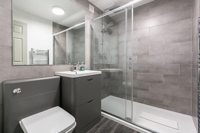 Whilst a second bedroom is set to the front, similarly well-finished with carpeted flooring and a built-in storage cupboard. Completing the accommodation, the stylish shower room is fitted with a modern suite with a large shower cubicle with a mains mixer and a rainfall showerhead, tiled splash walls, wood effect flooring and a ladder-style radiator.
